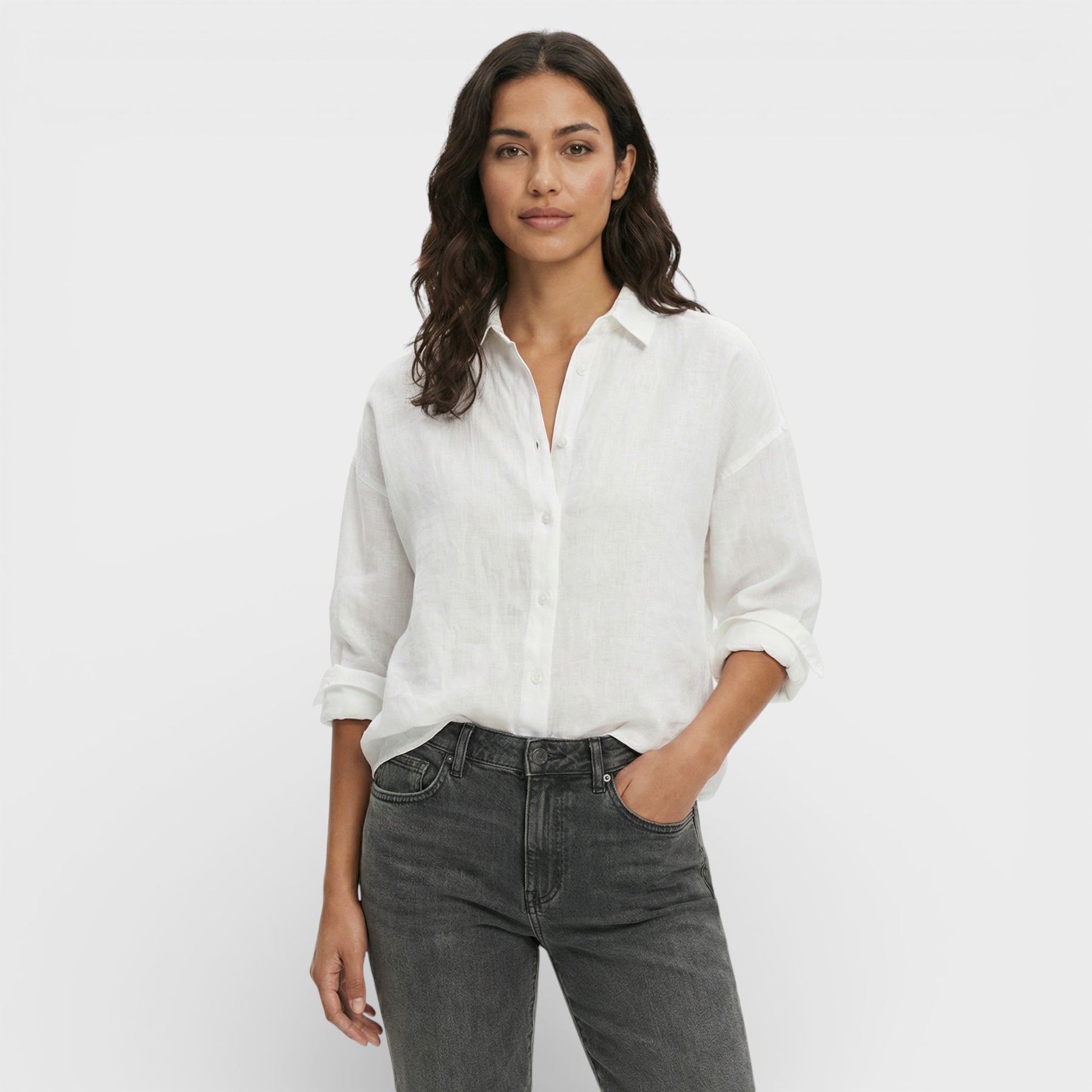 Esta camisa de lino para mujer combina una caída suave con una silueta relajada que resulta cómoda durante horas. Su diseño clásico mantiene un acabado pulido, fácil de adaptar tanto para trabajo como para planes más informales. Llévala por dentro para un look más elegante o suelta para un estilo desenfadado.
