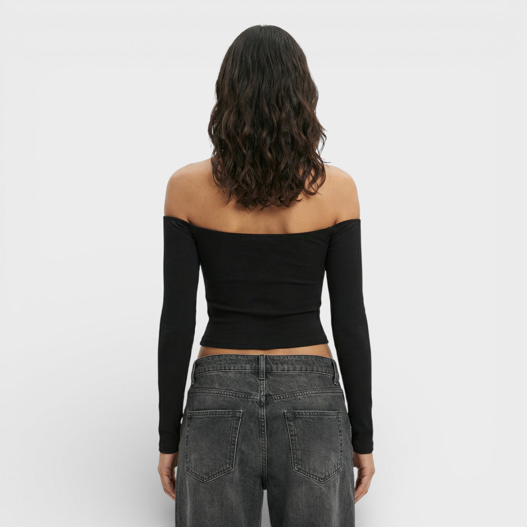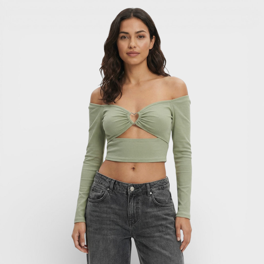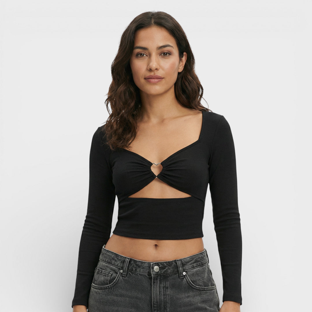 Un top corto con manga larga y escote en V que estiliza y eleva cualquier look esta temporada. El detalle central en forma de corazón y la abertura frontal crean un efecto favorecedor, perfecto con vaqueros o pantalones de tiro alto.