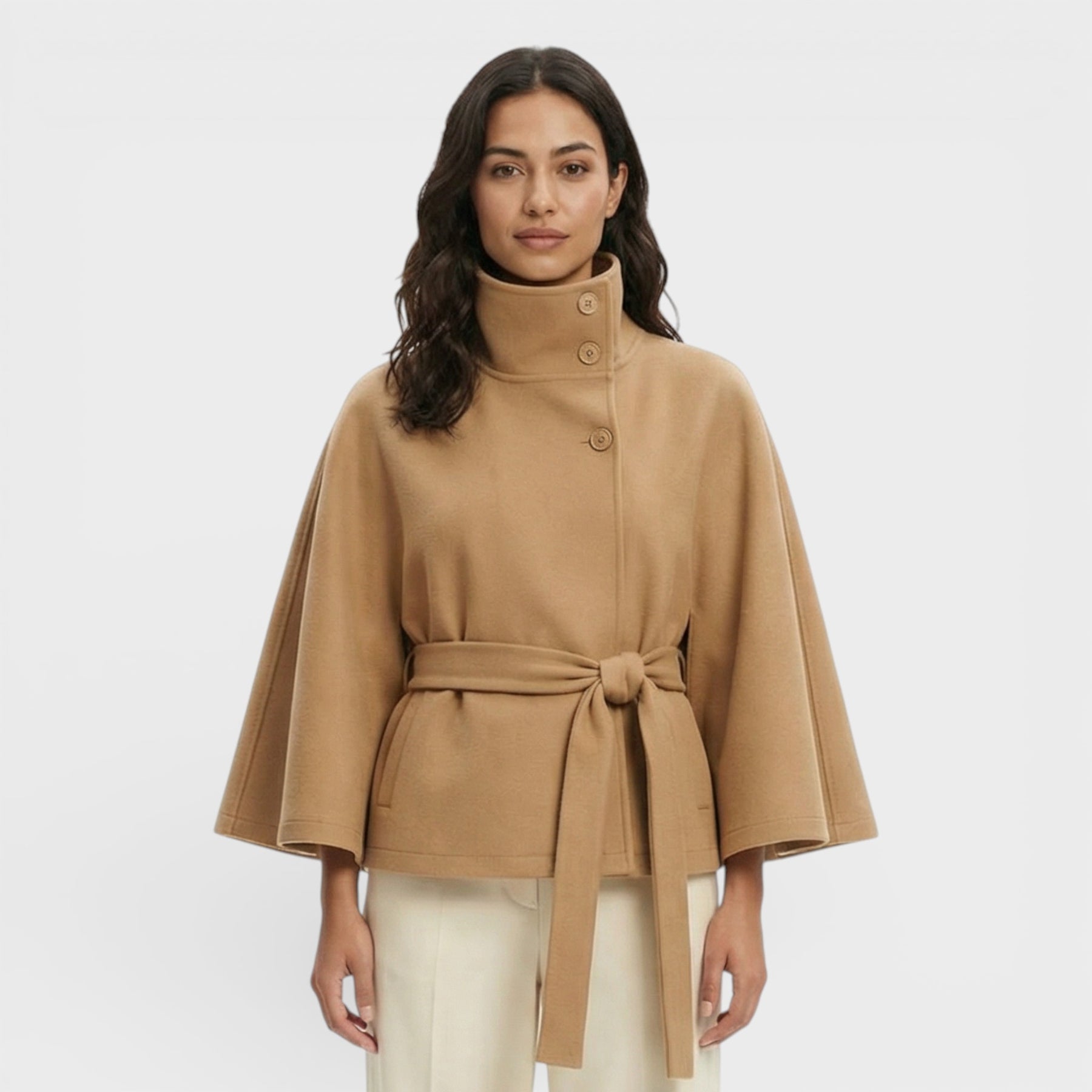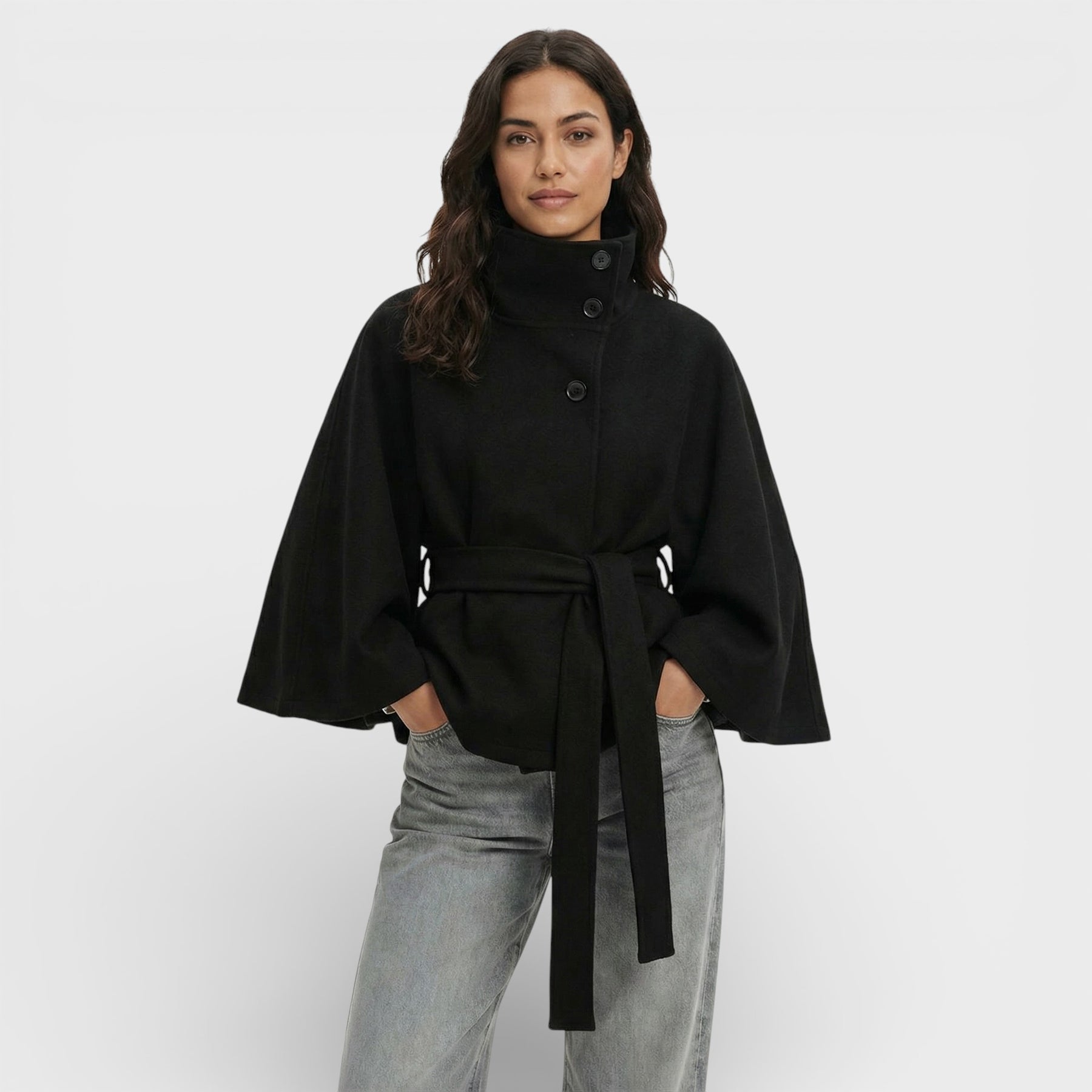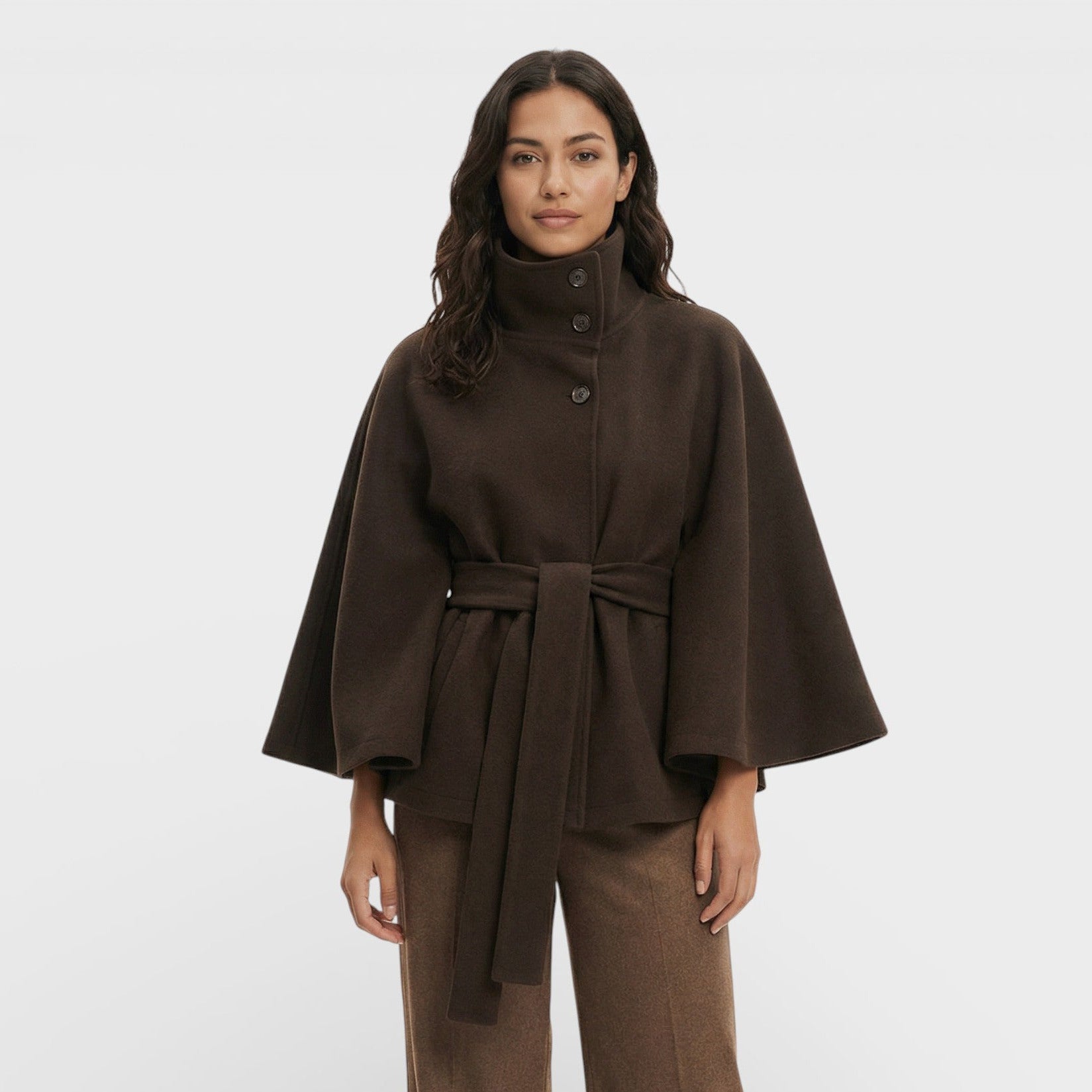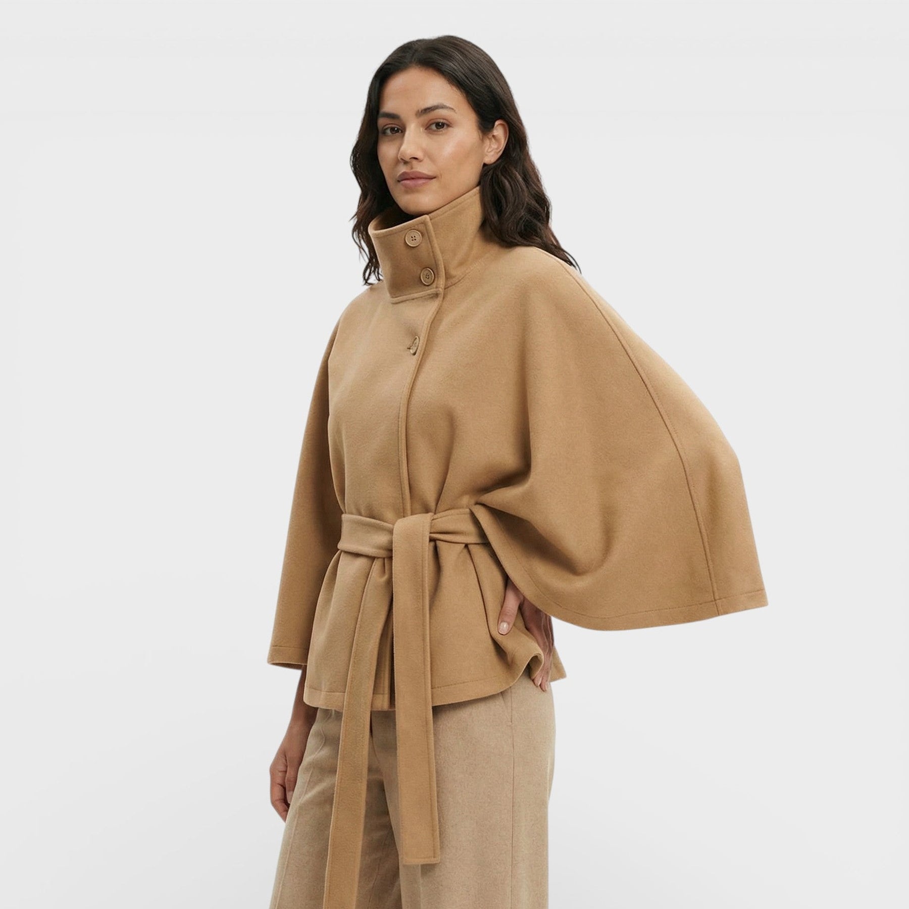 Este abrigo tipo capa aporta una silueta pulida y moderna con un cuello alto que eleva el look al instante. Su corte en línea A y las mangas capa caen con fluidez sobre prendas de punto, manteniendo proporciones equilibradas con vestidos, faldas o denim. Un básico sofisticado y práctico para días urbanos, fines de semana y planes de noche.