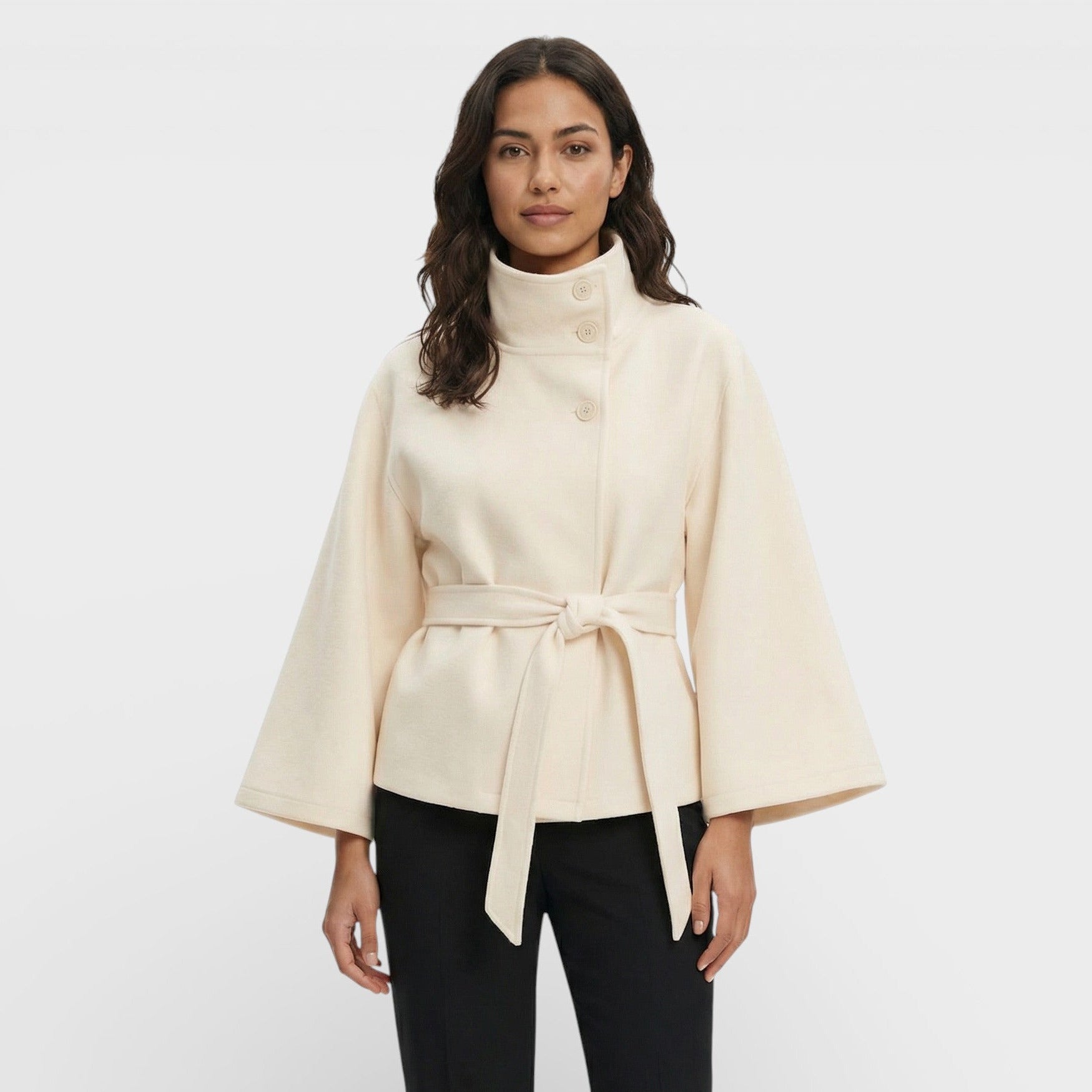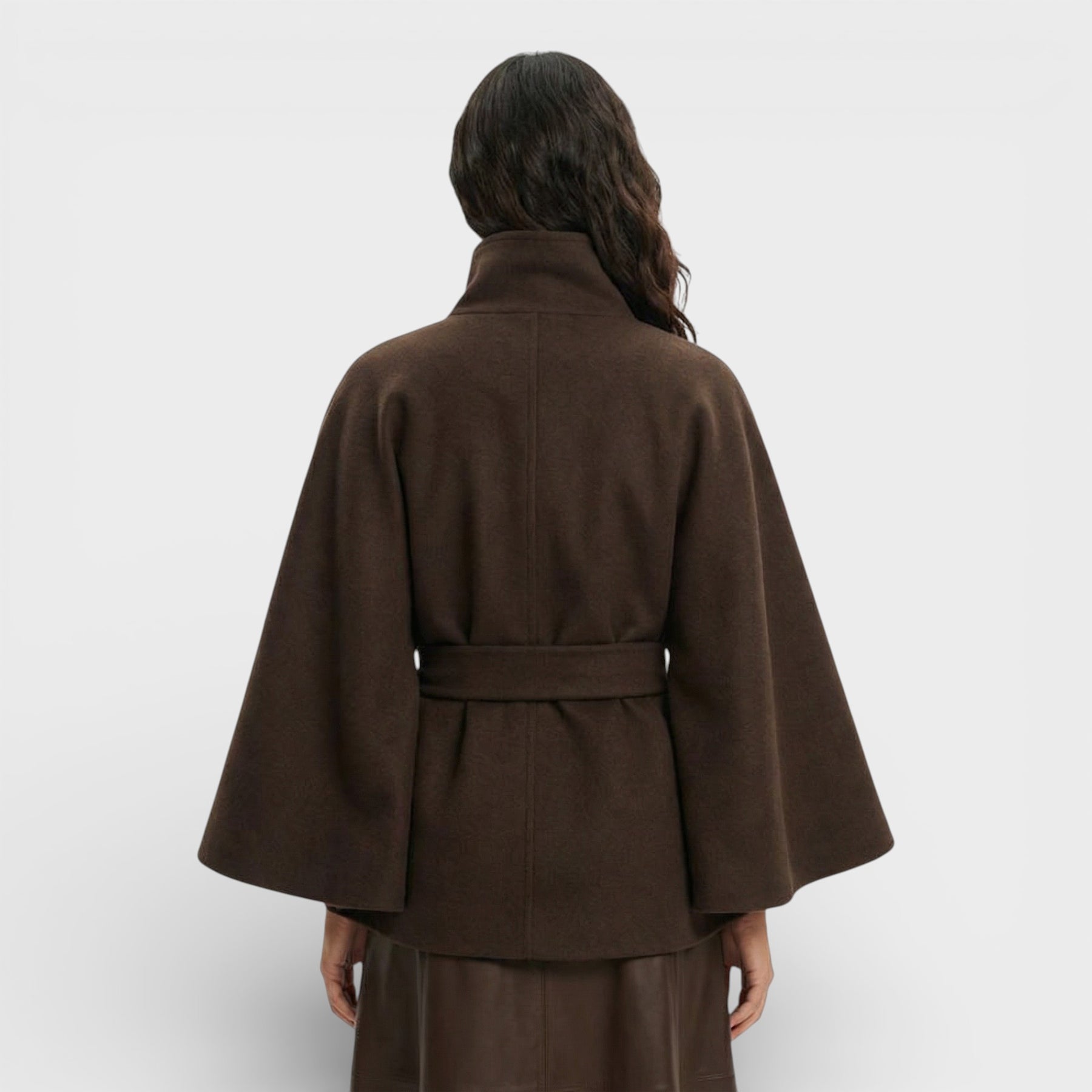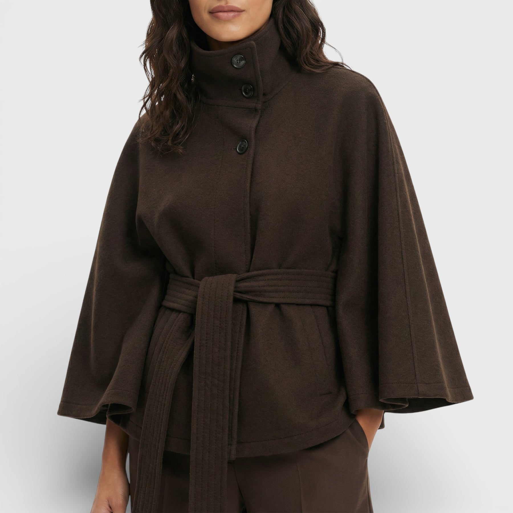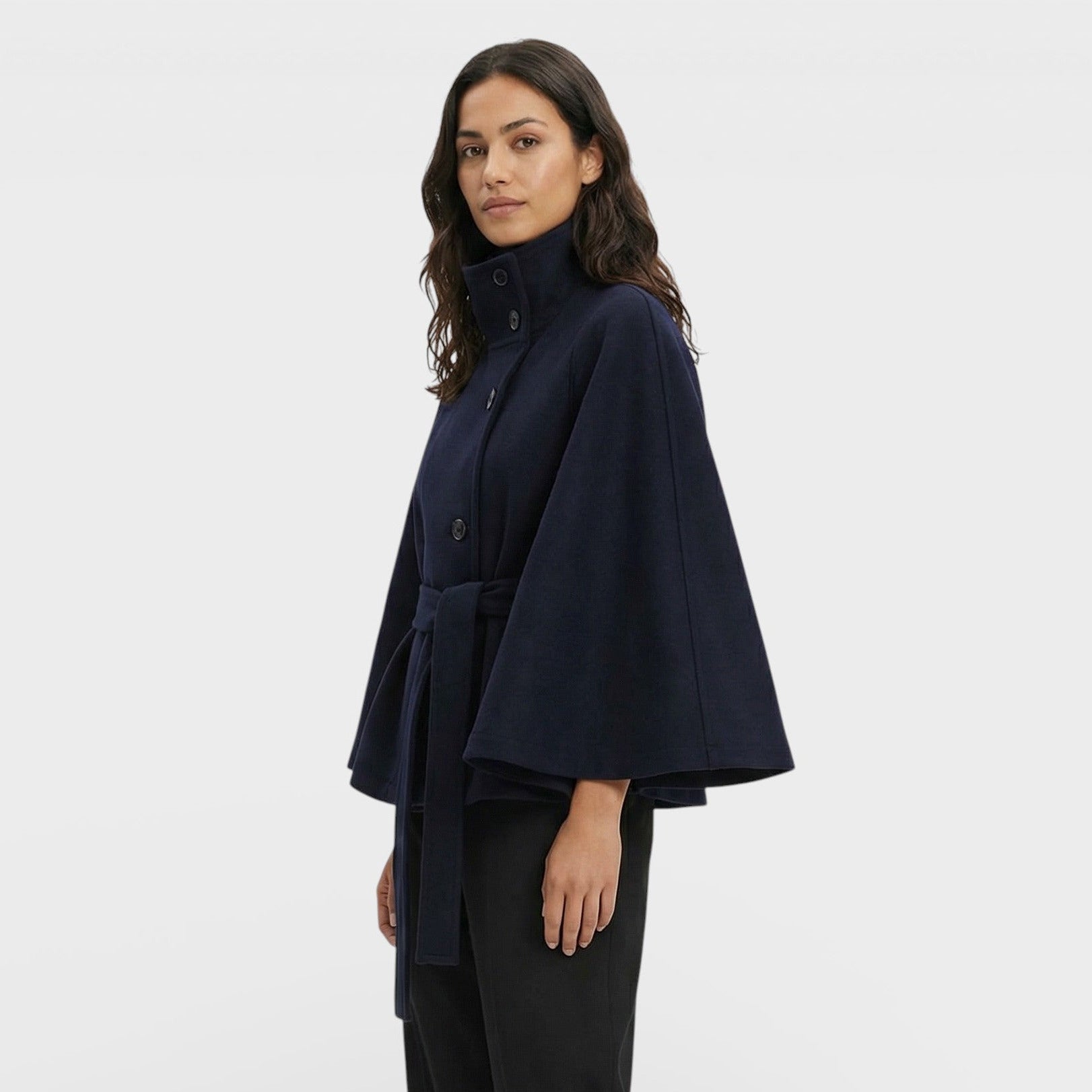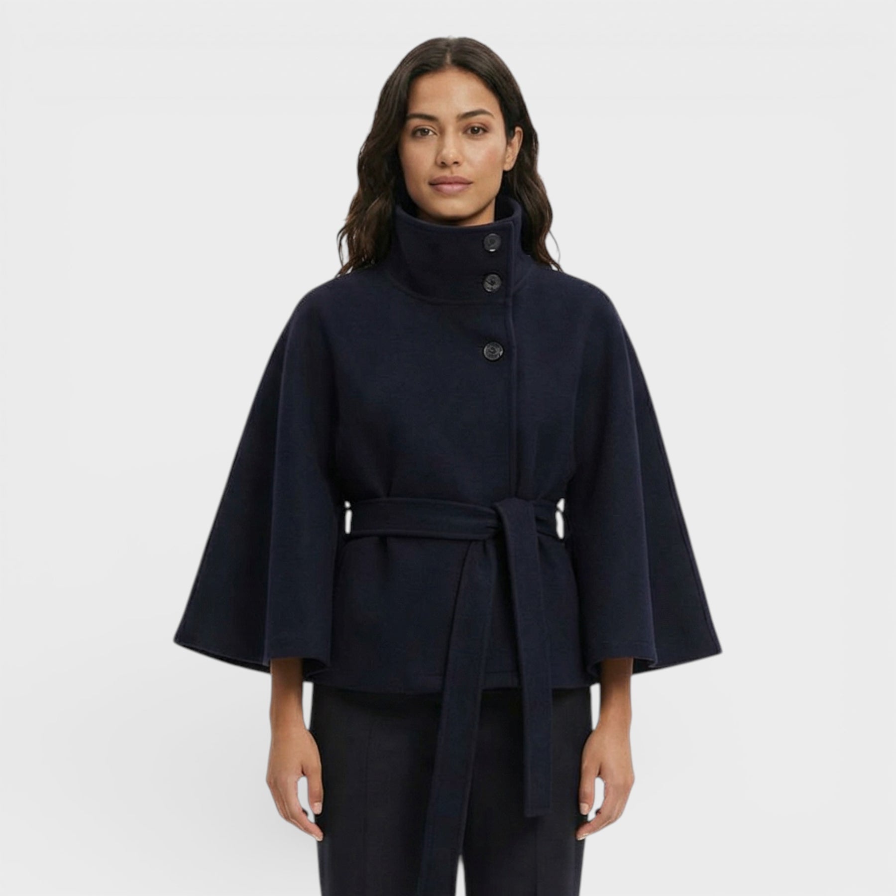 Este abrigo tipo capa aporta una silueta pulida y moderna con un cuello alto que eleva el look al instante. Su corte en línea A y las mangas capa caen con fluidez sobre prendas de punto, manteniendo proporciones equilibradas con vestidos, faldas o denim. Un básico sofisticado y práctico para días urbanos, fines de semana y planes de noche.