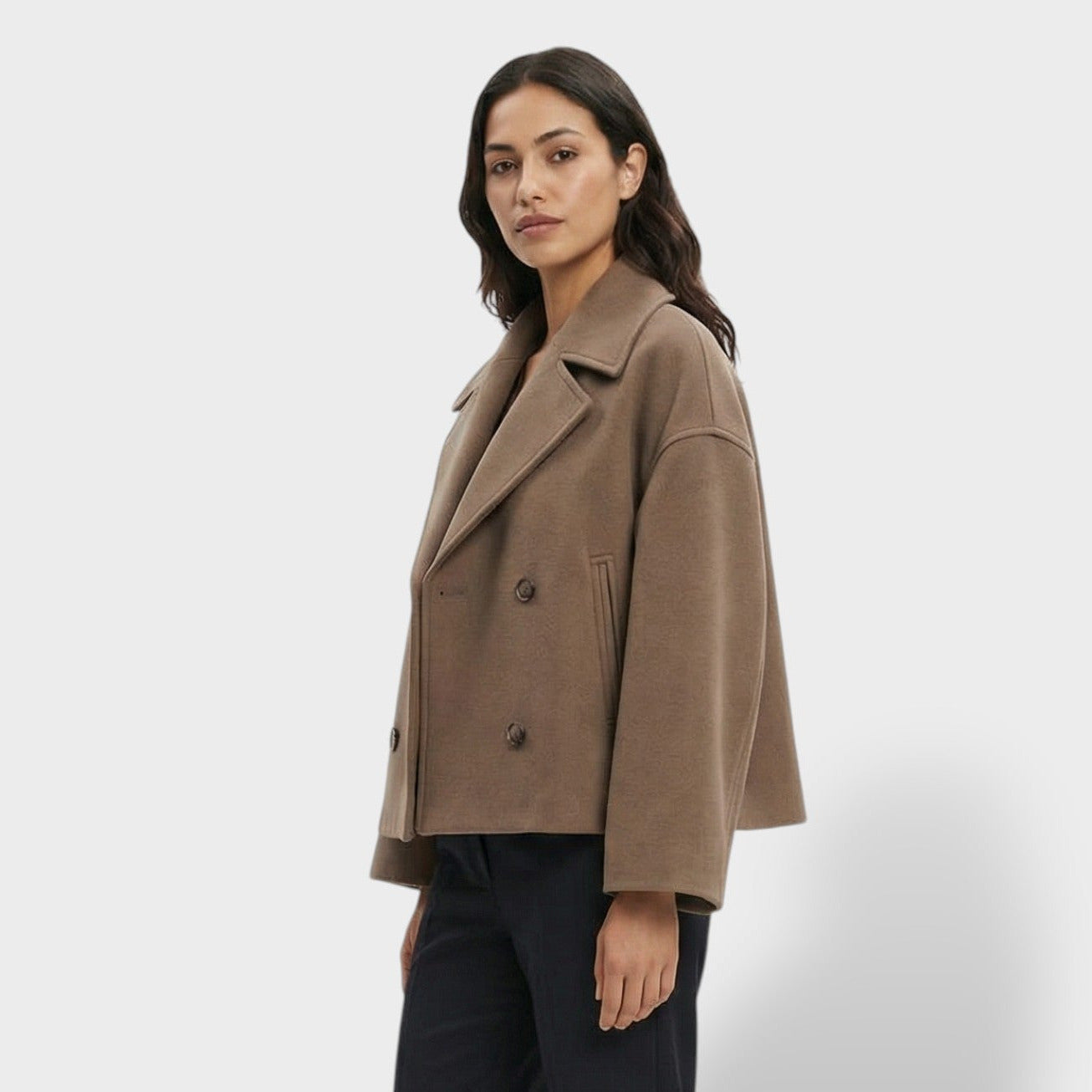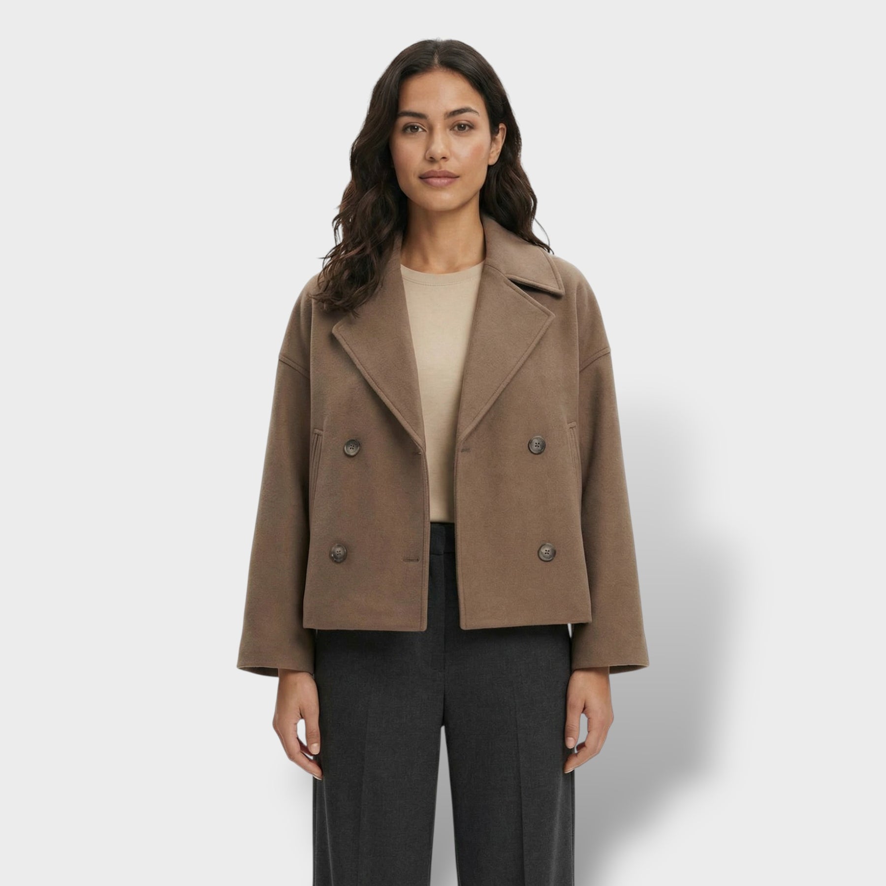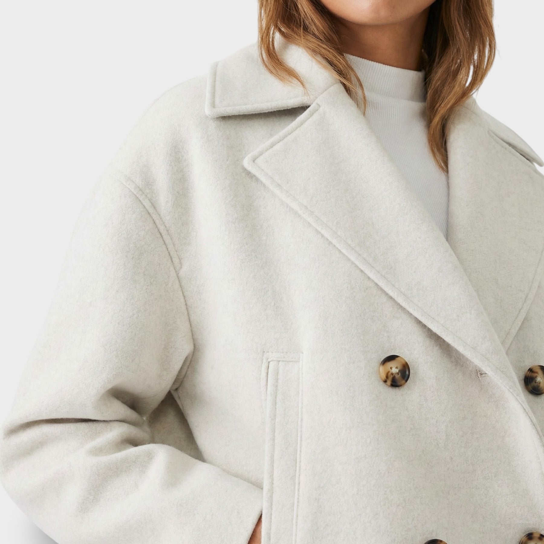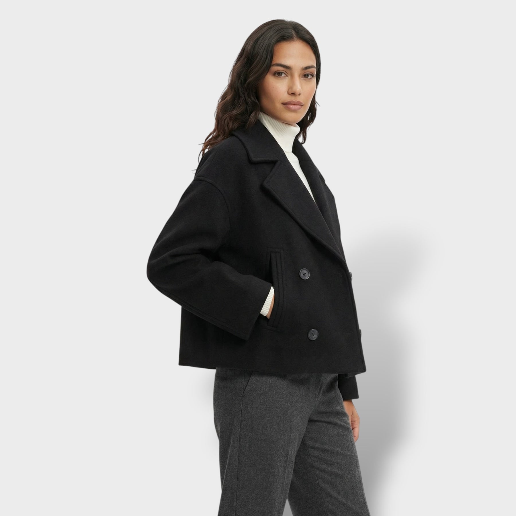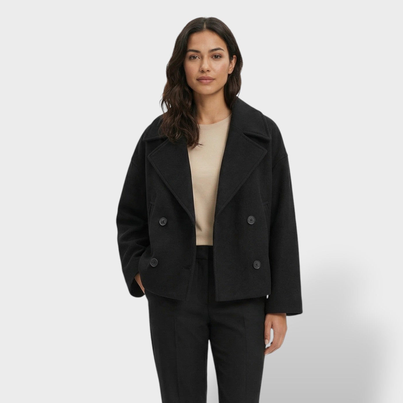 Este abrigo corto de lana aporta un aire elegante y actual para el día a día. La doble botonadura suma estructura y presencia sin perder comodidad, mientras el cuello vuelto enmarca el rostro con un acabado clásico y favorecedor. Una pieza versátil para los días frescos en España, ideal para transitar de la oficina a planes de tarde con estilo.