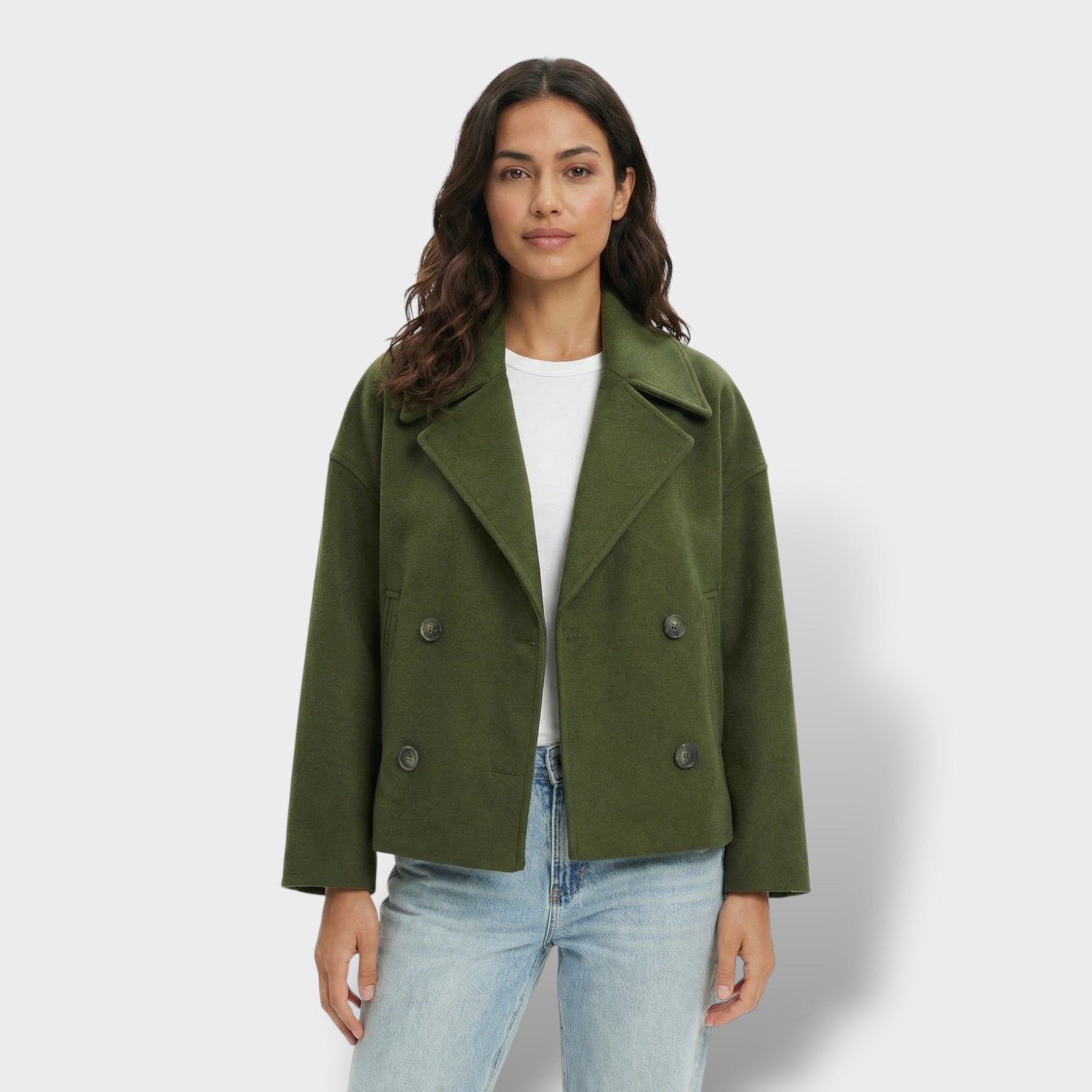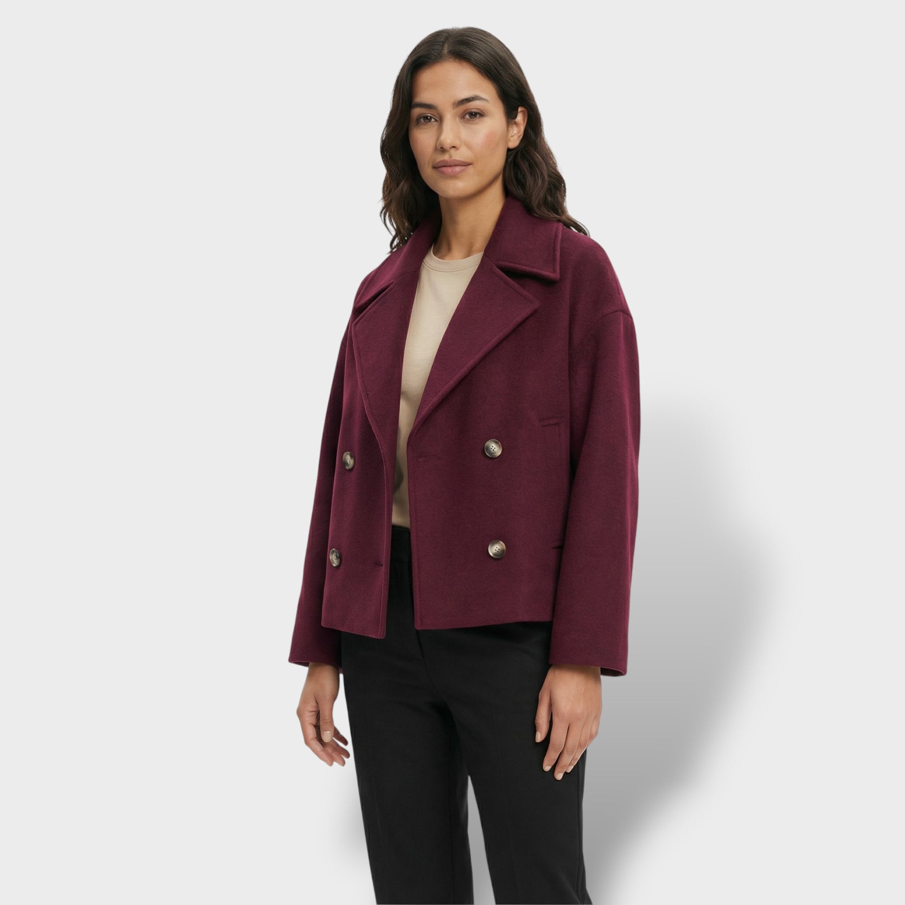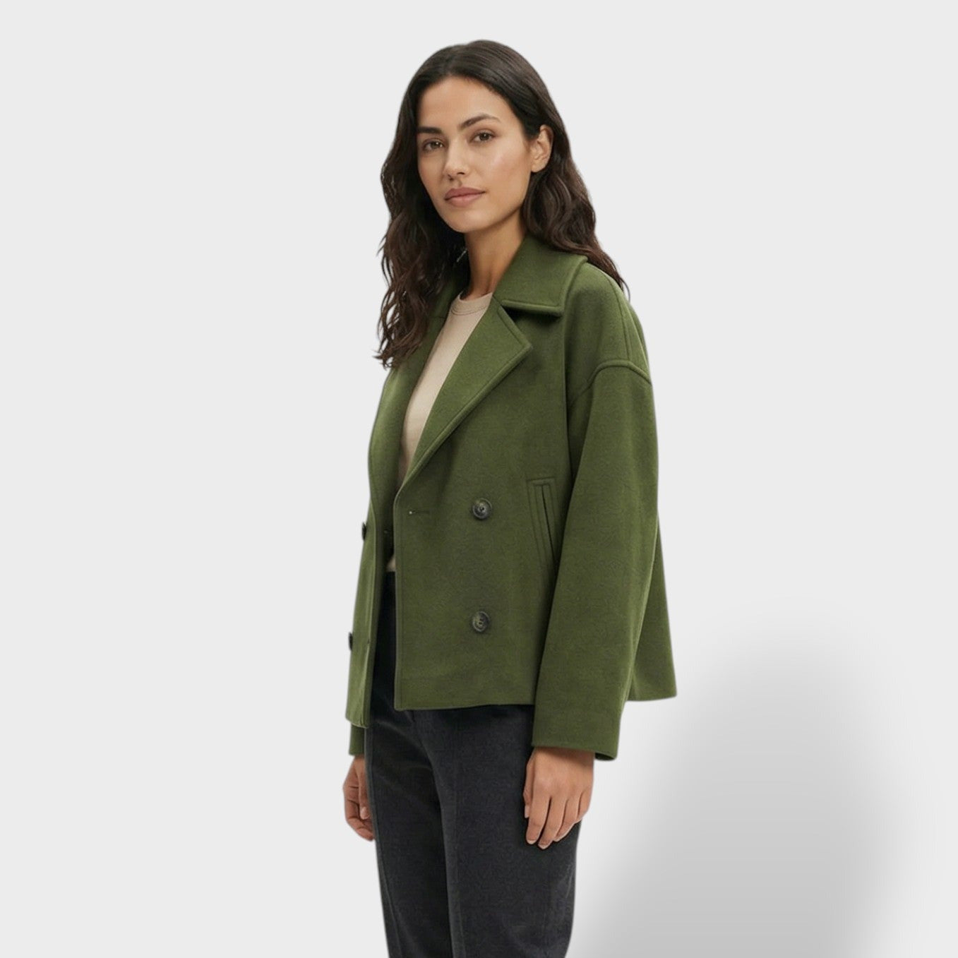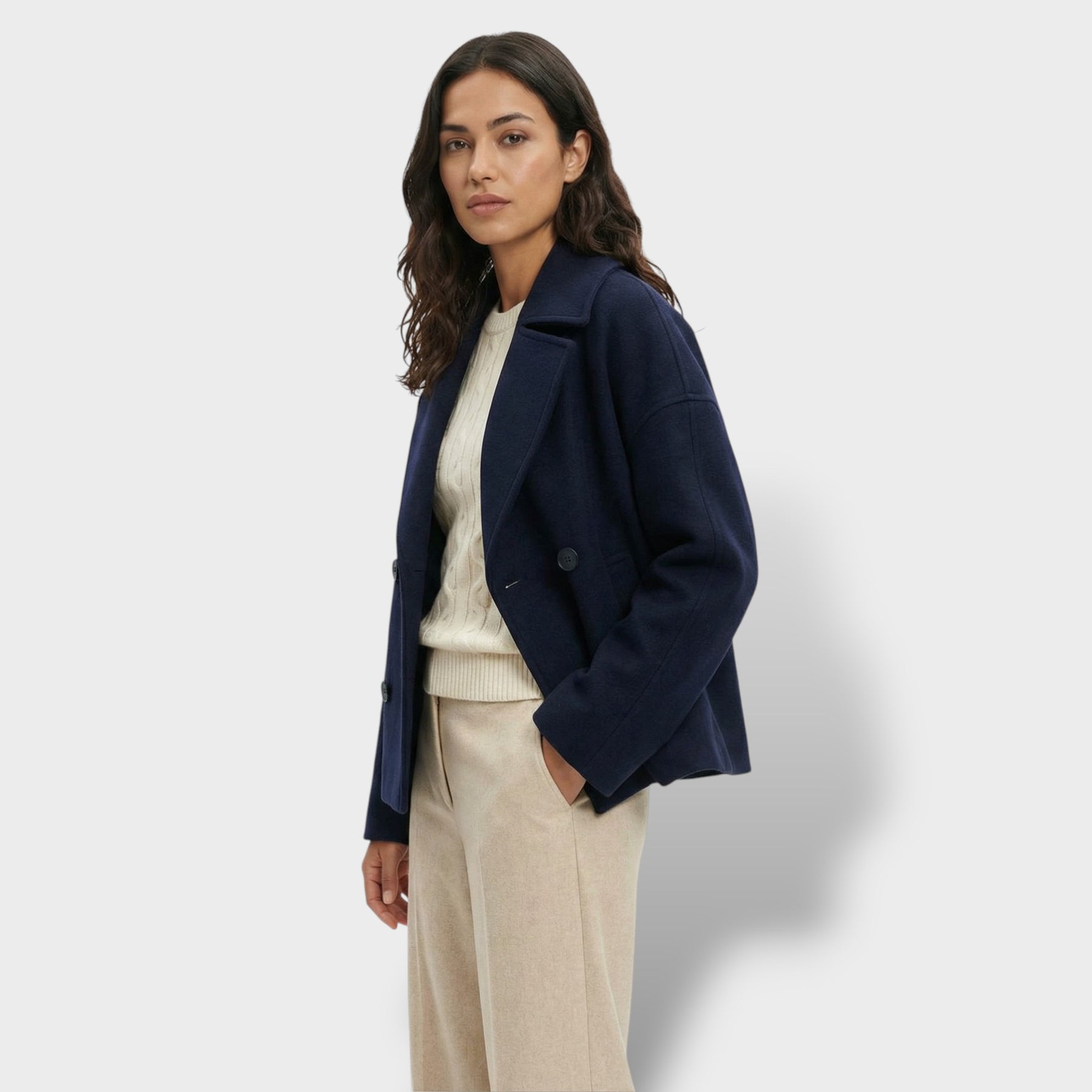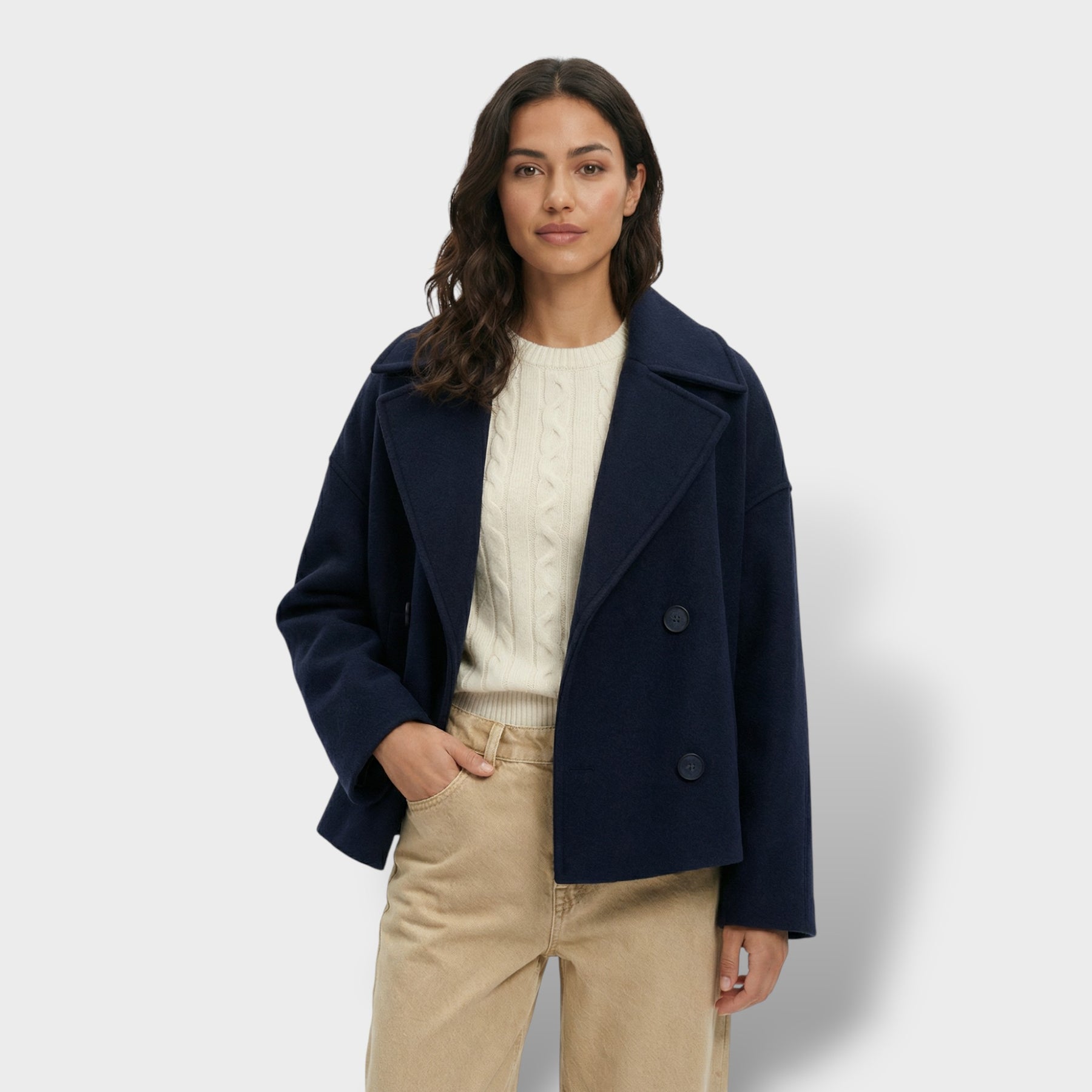 Este abrigo corto de lana aporta un aire elegante y actual para el día a día. La doble botonadura suma estructura y presencia sin perder comodidad, mientras el cuello vuelto enmarca el rostro con un acabado clásico y favorecedor. Una pieza versátil para los días frescos en España, ideal para transitar de la oficina a planes de tarde con estilo.