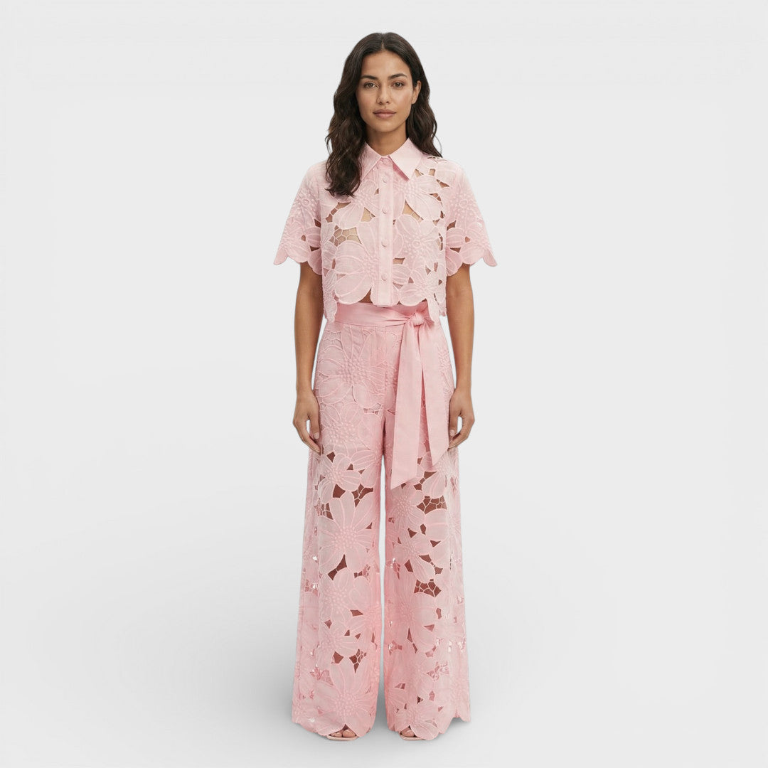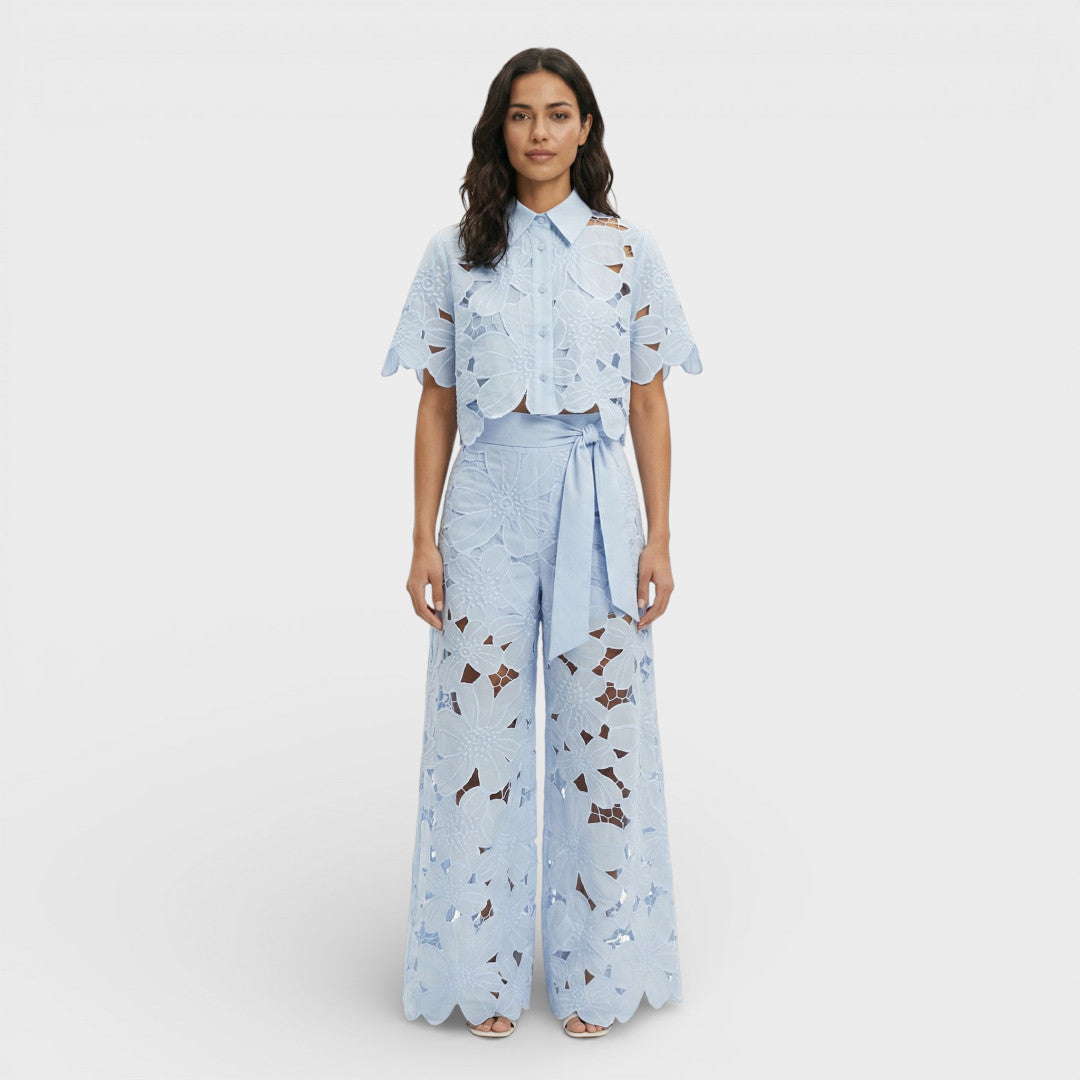 Un conjunto de dos piezas con camisa de solapa y pantalón ancho, con acabado calado que aporta un aire sofisticado y diferente. La cintura marcada y la silueta fluida estilizan y crean un look pulido para planes especiales.