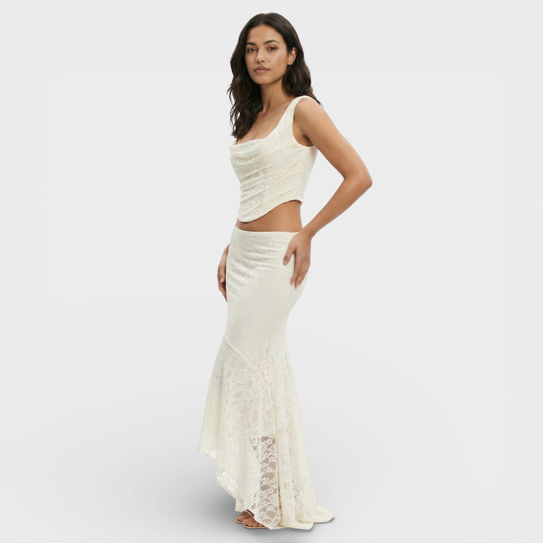 Un conjunto elegante de dos piezas con top corto y falda maxi, ideal para eventos y looks de invitada esta temporada. La silueta ajustada y el acabado delicado crean un efecto sofisticado que estiliza sin esfuerzo.