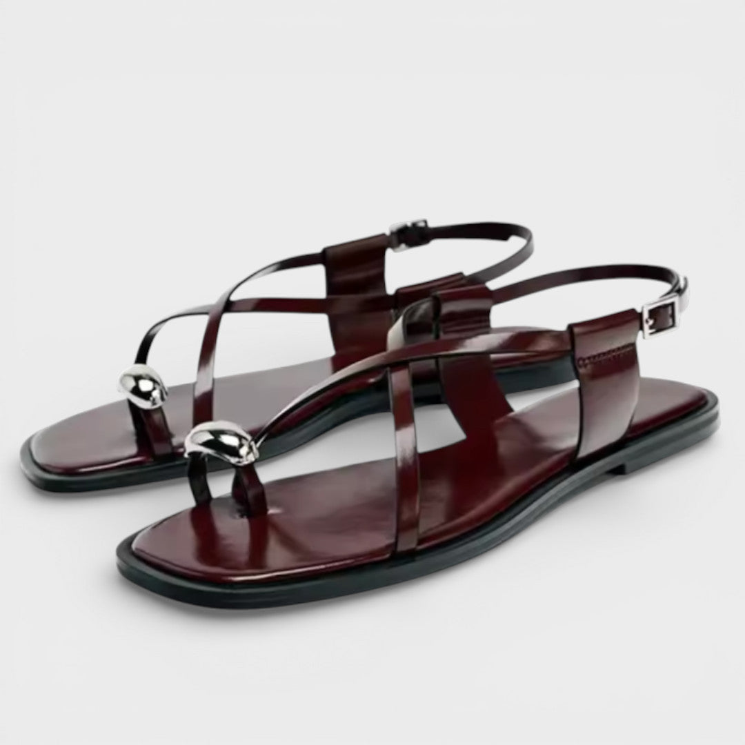 Sandalias planas de líneas limpias con correa cruzada y detalle metálico, pensadas para un look cuidado y cómodo. La sujeción al talón y la punta cuadrada las hacen fáciles de llevar con vestidos, lino o denim.