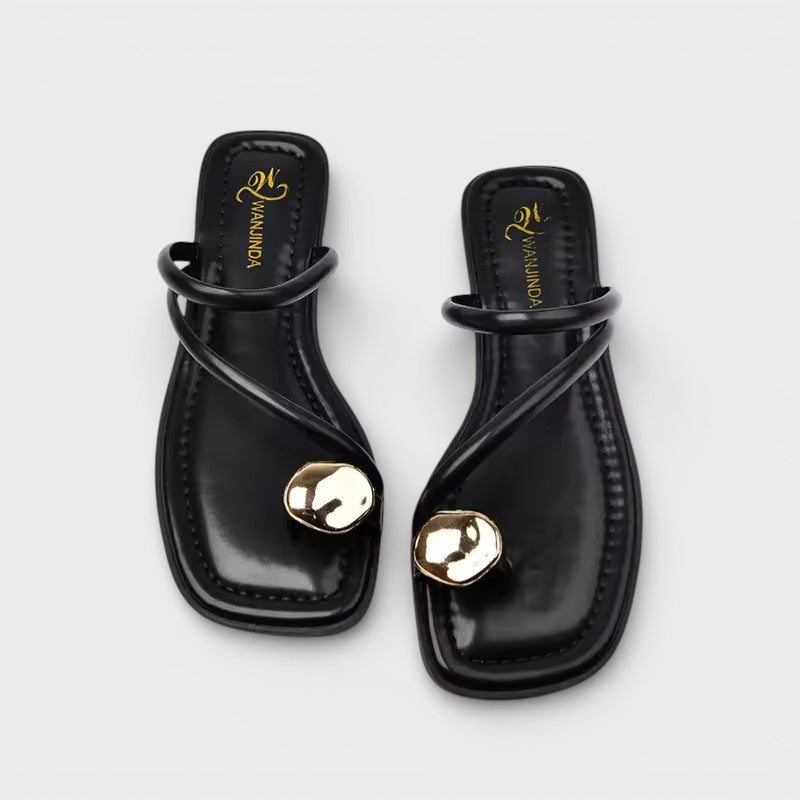 Estas sandalias planas para mujer combinan una silueta estilizada con un detalle metálico que aporta un toque moderno. Su diseño abierto y ligero las convierte en una opción práctica y sofisticada para los días cálidos.