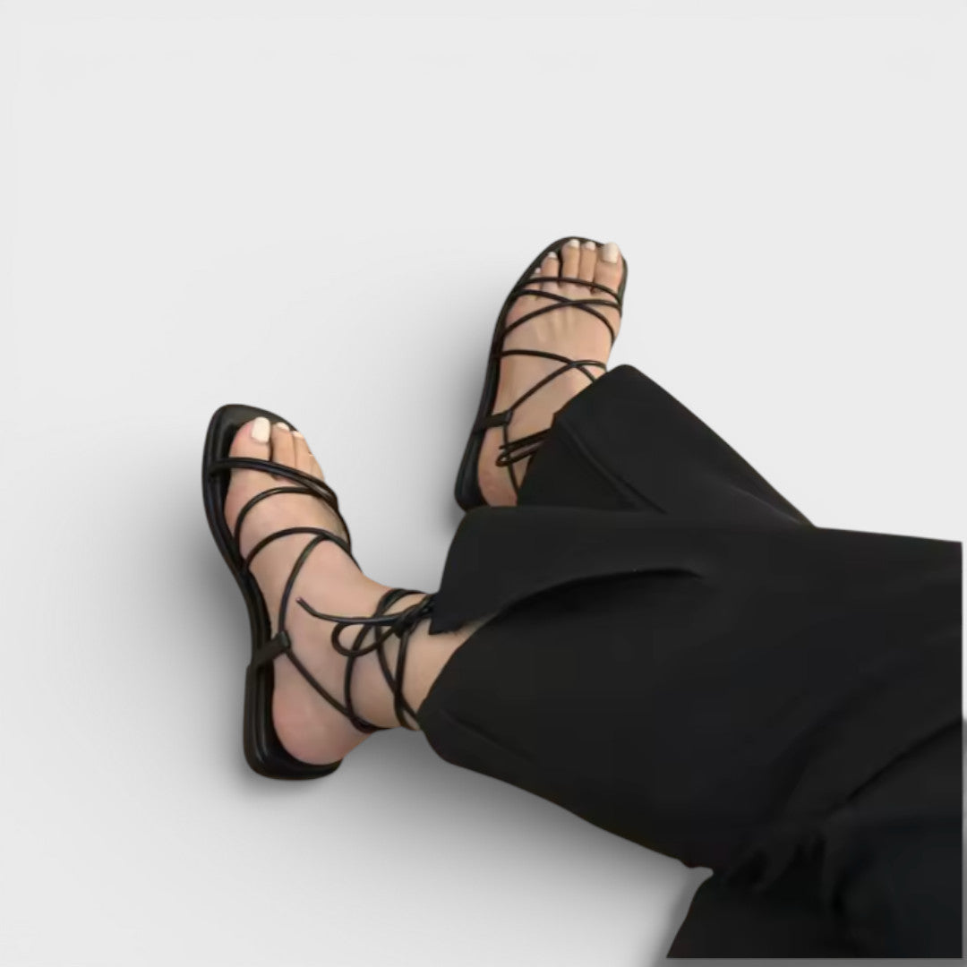 Sandalias planas de tiras finas con punta cuadrada y diseño en V, perfectas para estilizar el pie esta temporada con un aire minimalista. Se atan al tobillo y combinan fácil con vestidos fluidos, lino o denim.