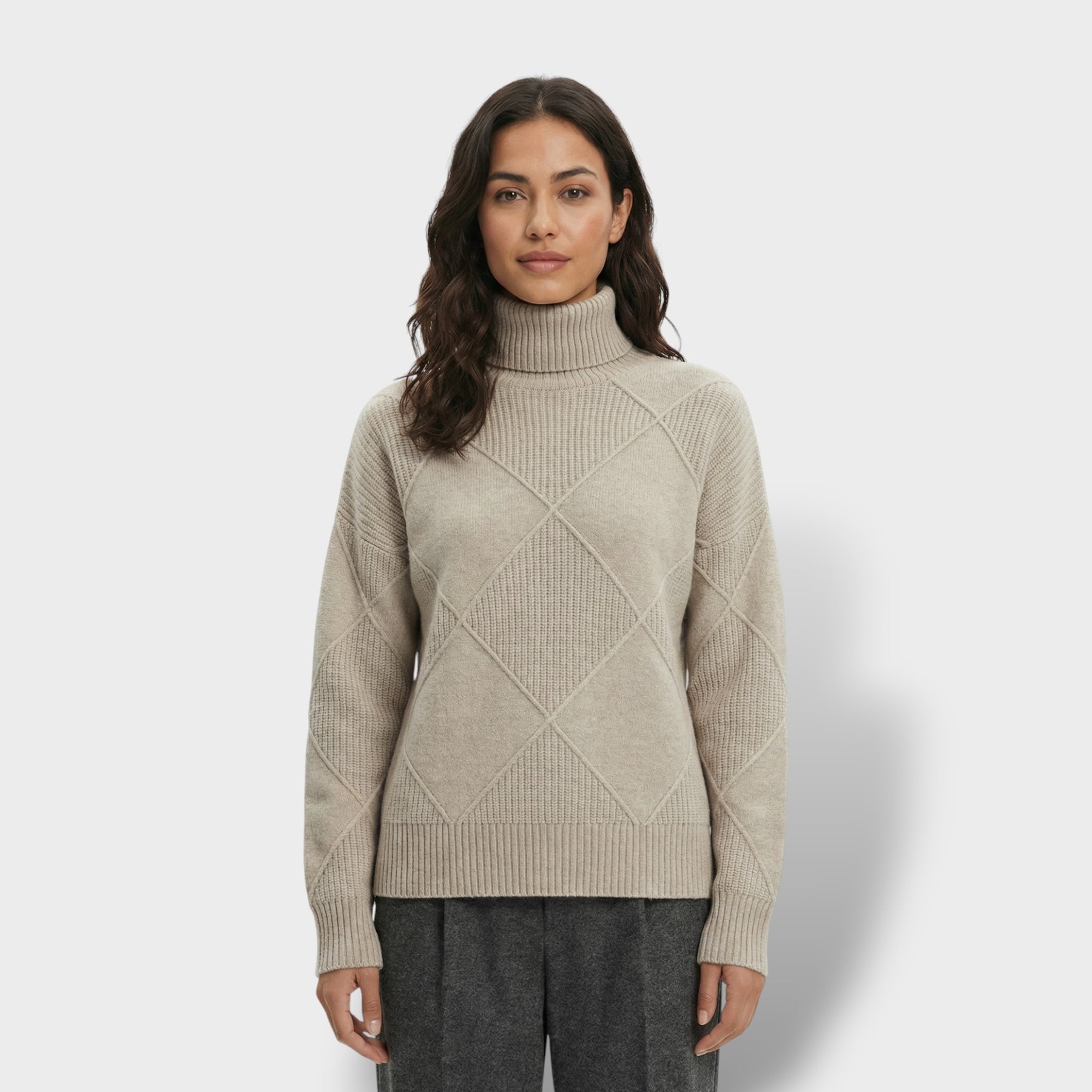 Este jersey de cuello alto aporta una presencia elegante y actual gracias a su punto con rombos, que añade textura y un acabado cuidado. El color liso ilumina el look y facilita combinaciones limpias, mientras el corte holgado cae con naturalidad para una comodidad diaria sin perder estilo. Ideal para llevarlo como protagonista o en capas bajo chaquetas y abrigos.