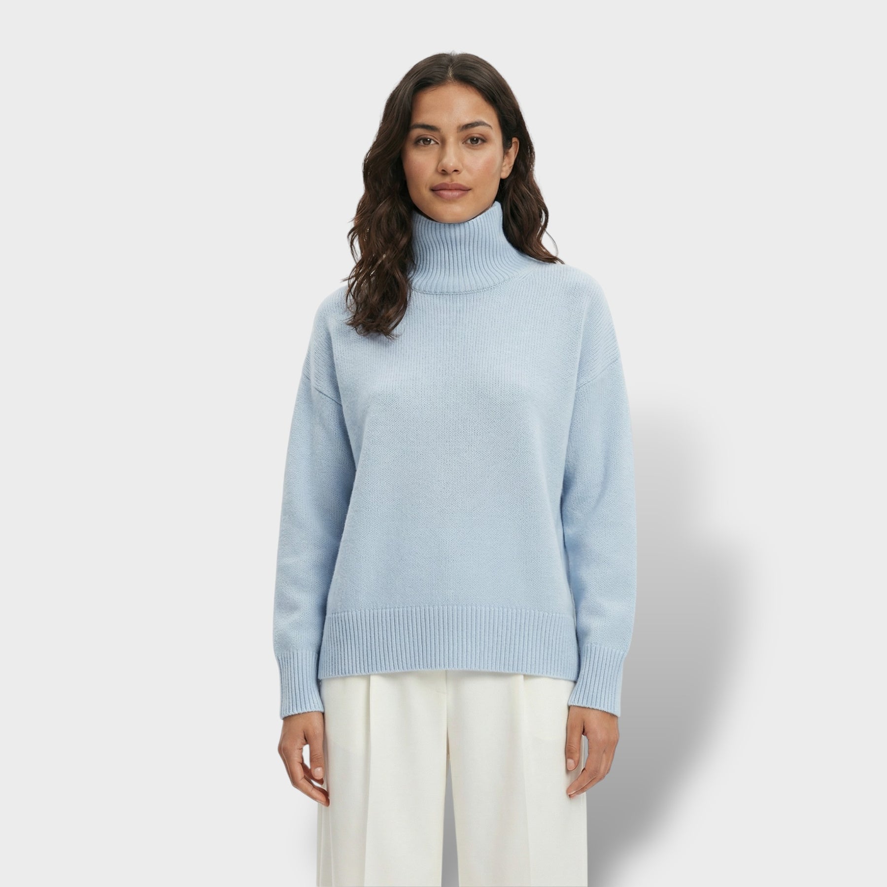 Este suéter de cuello alto combina sofisticación y confort en una prenda esencial para los días fríos. Su diseño cuidado y su tejido agradable al tacto ofrecen abrigo sin renunciar a una estética elegante, adaptándose con facilidad tanto a looks informales como a conjuntos más formales.