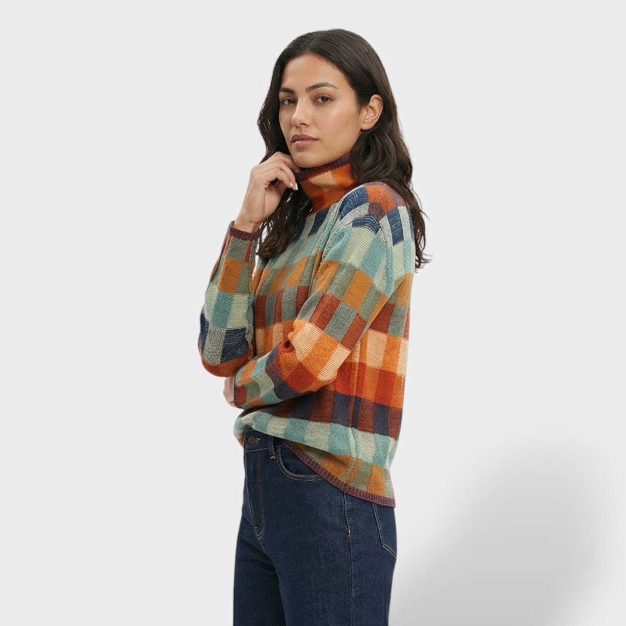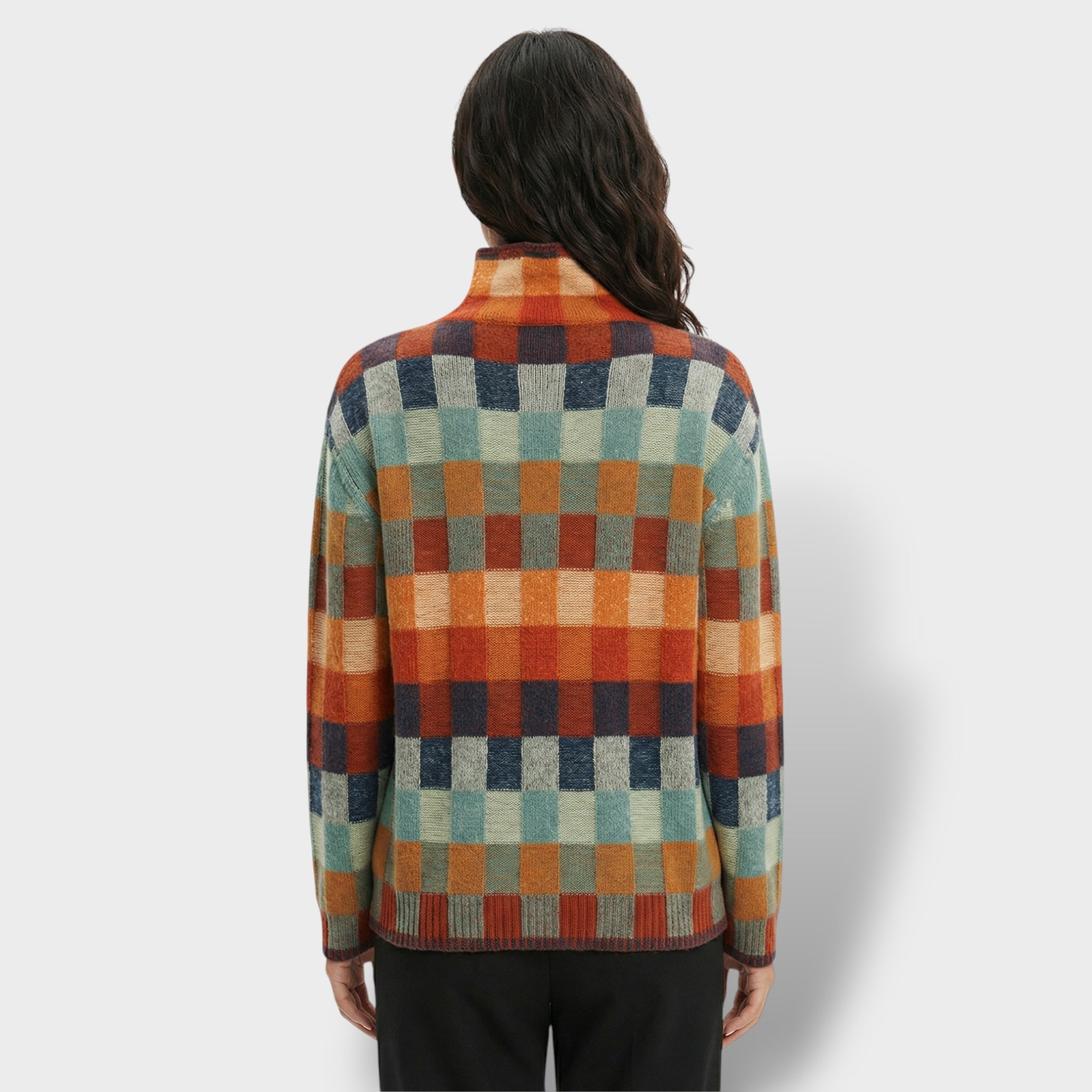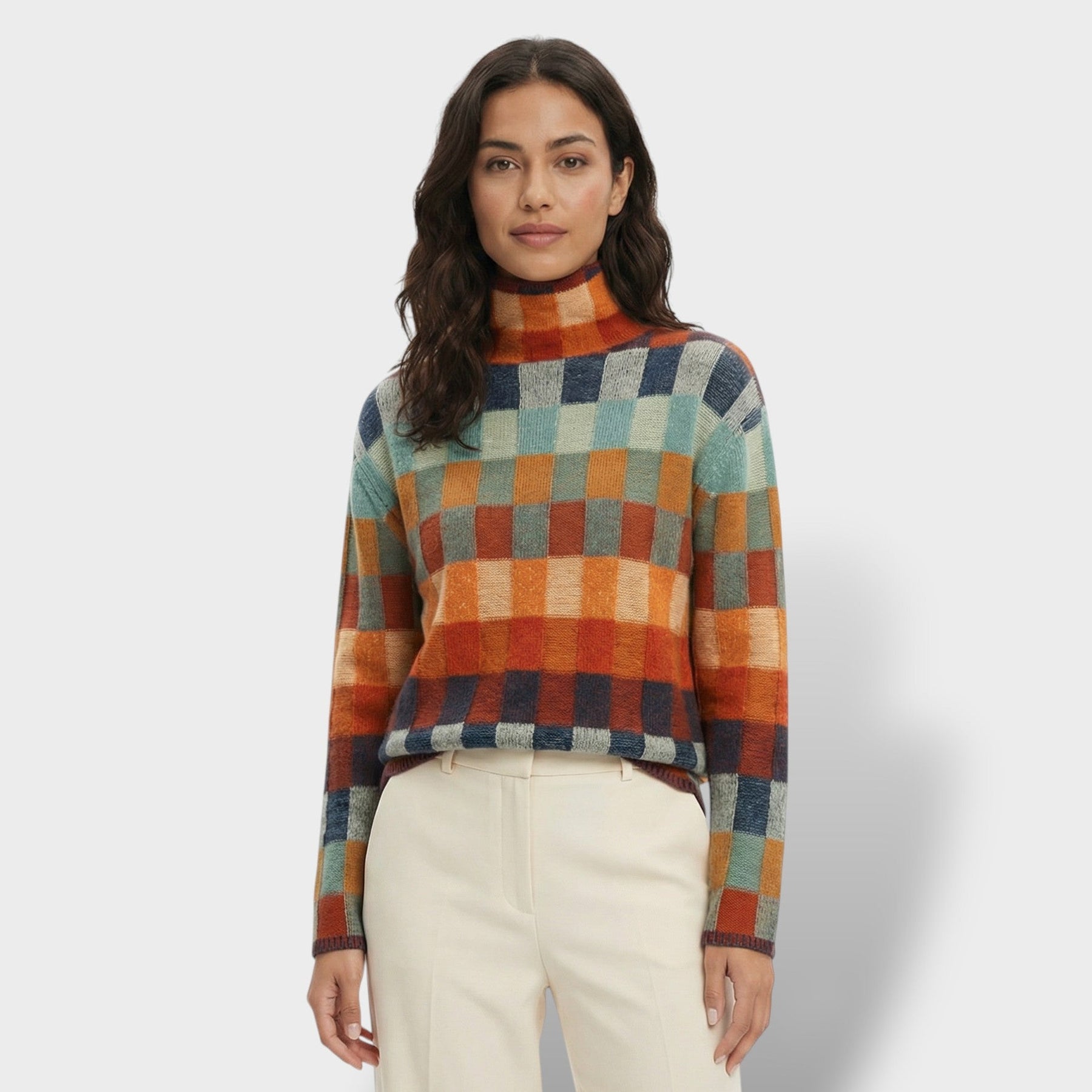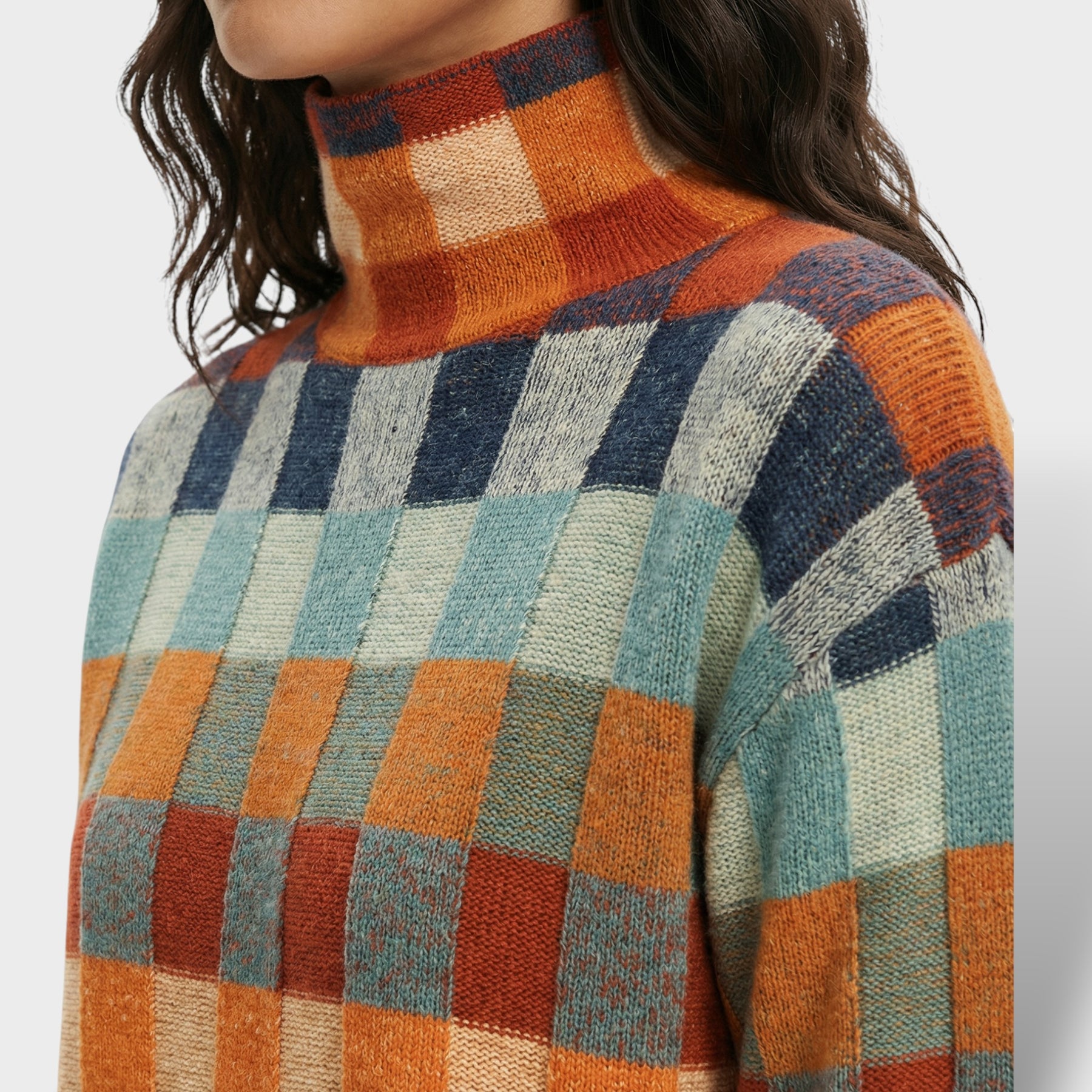 Este suéter de punto a cuadros aporta un toque vibrante y actual a los looks de otoño e invierno. Su diseño de cuello alto y bloques de color crea una silueta llamativa y cómoda, ideal para combinar estilo y abrigo en el día a día con una estética moderna y cuidada.