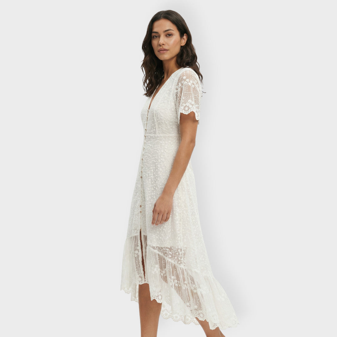 Un vestido blanco de aire boho con escote en V, botones frontales y caída fluida que acompaña el movimiento con delicadeza. Los detalles de encaje en mangas y bajo aportan un acabado romántico, perfecto para un look pulido y natural.