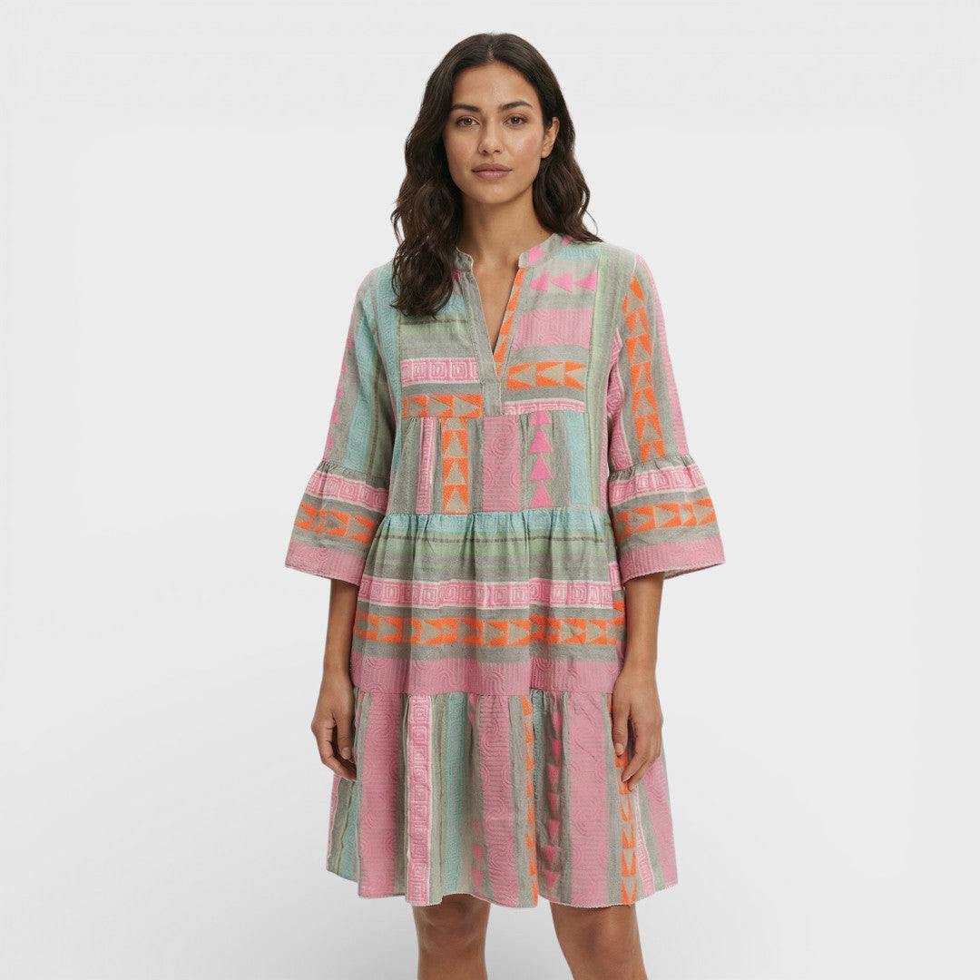Un vestido boho de corte amplio con estampado vibrante y caída ligera, perfecto para días relajados esta temporada. Su silueta con volantes aporta movimiento y un aire desenfadado, ideal con sandalias o alpargatas.
