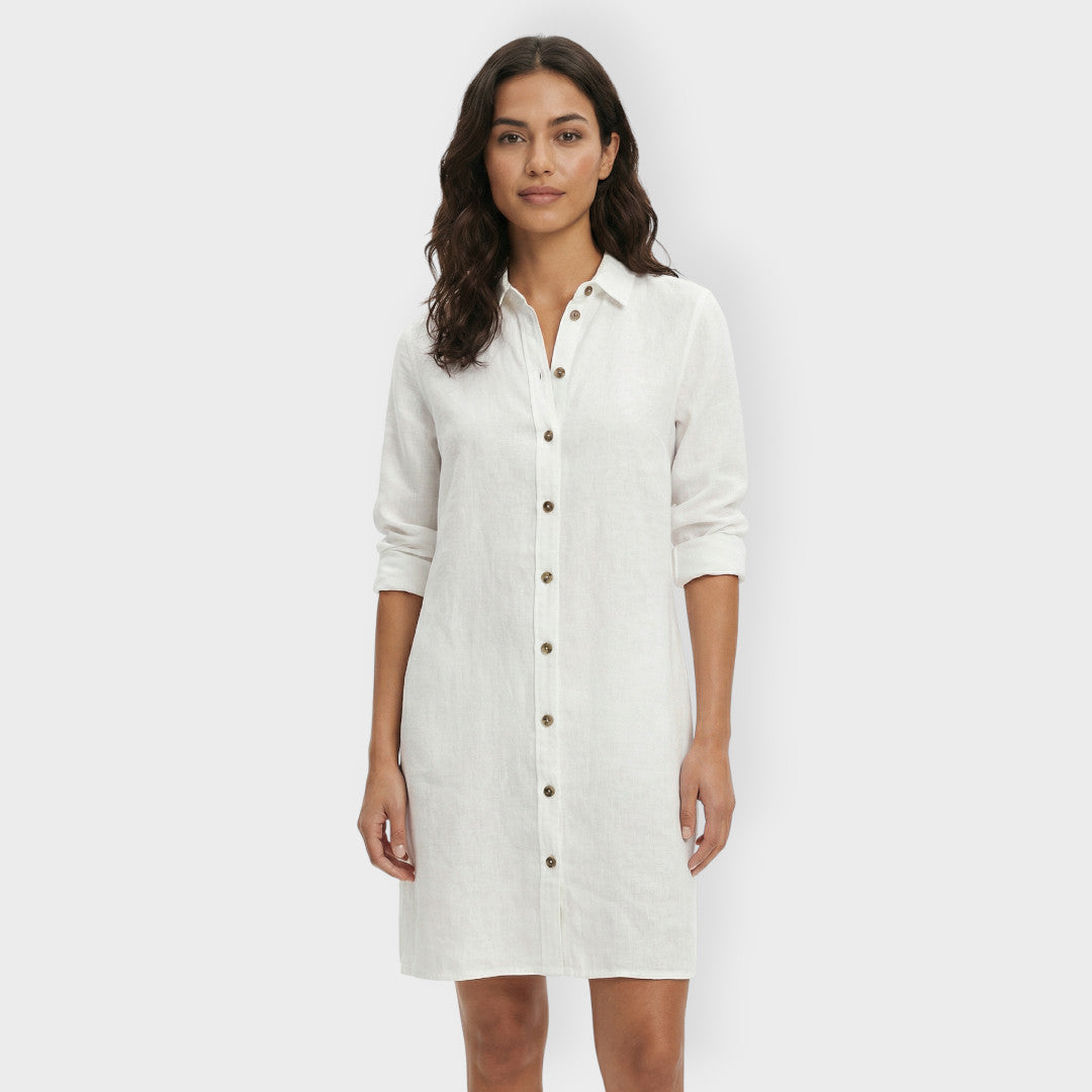 Un vestido camisero blanco con botones frontales y manga a media altura, pensado para un look limpio y fácil de llevar. Su silueta relajada aporta comodidad sin perder un acabado pulido, ideal con sandalias o zapatillas.