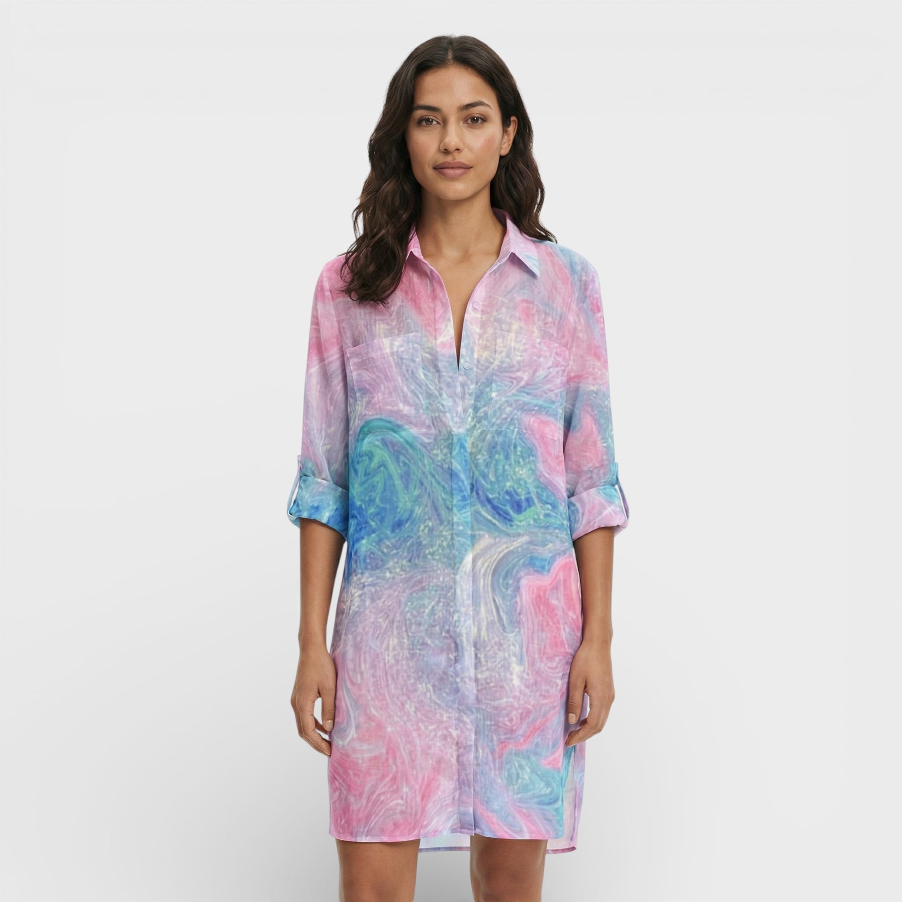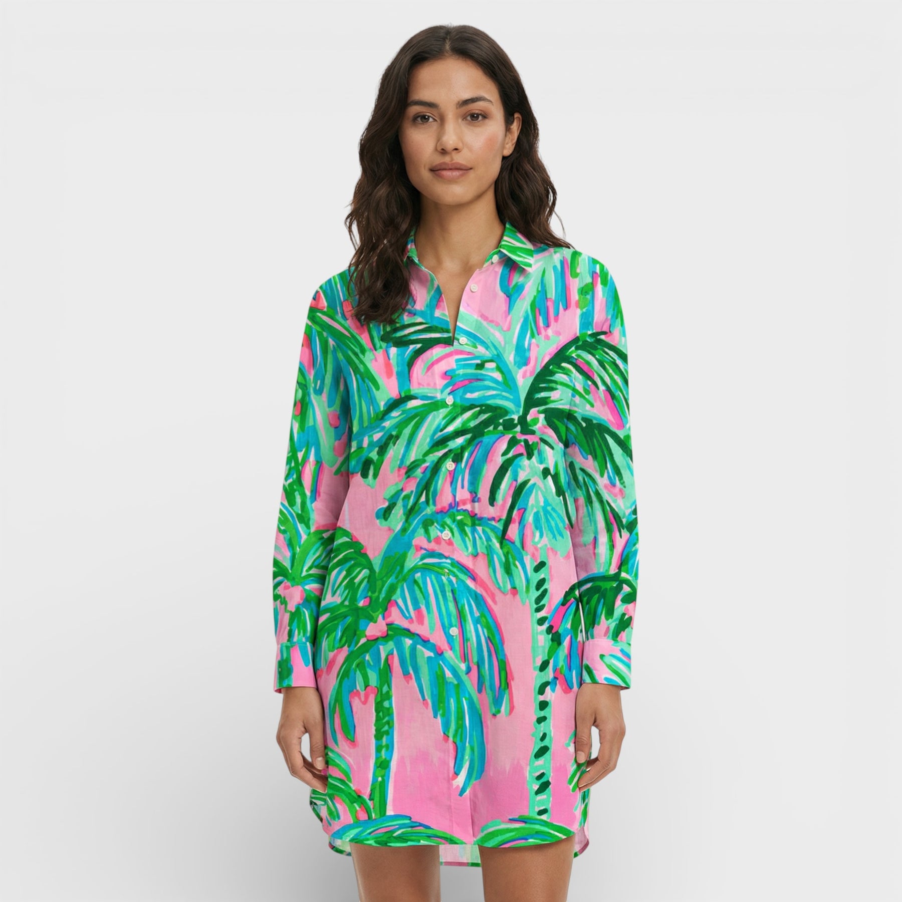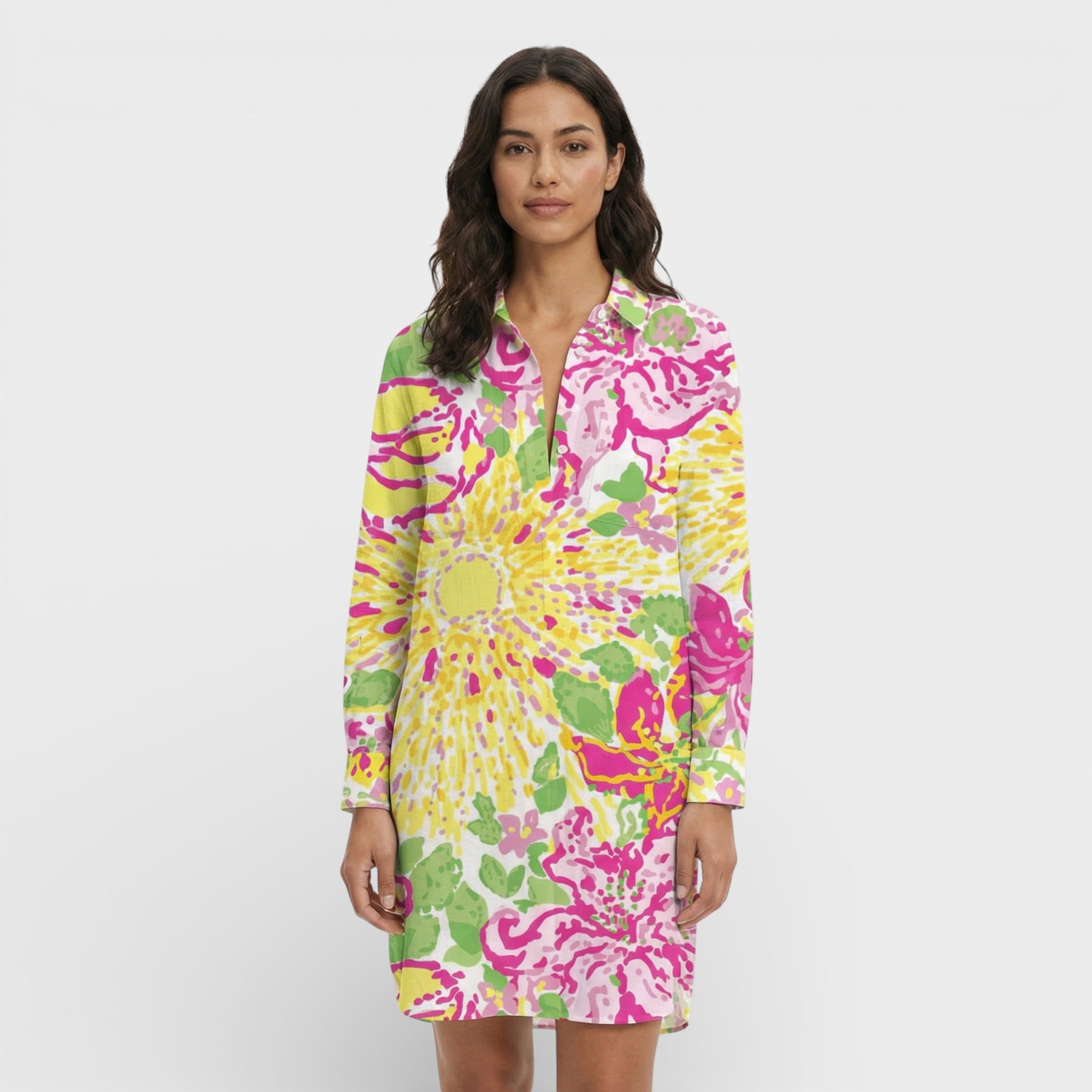 Este vestido camisero largo aporta un aire luminoso y femenino con una silueta en línea A que cae con suavidad y favorece sin esfuerzo. El cuello clásico y el cierre de botones mantienen un acabado pulido, mientras los bolsillos añaden un punto práctico para el día a día. Una pieza versátil, perfecta para planes al aire libre o looks relajados con un toque cuidado.