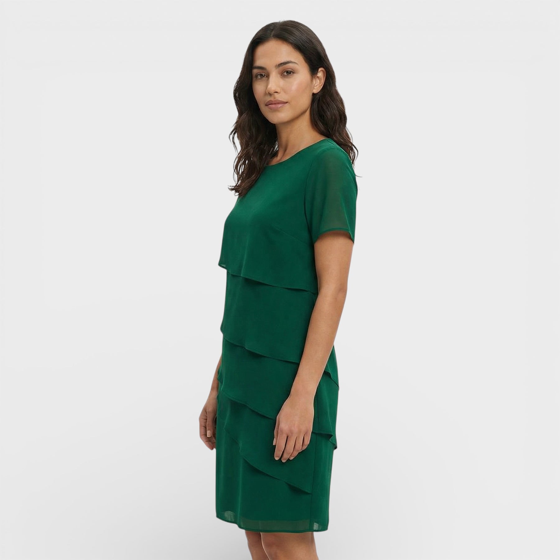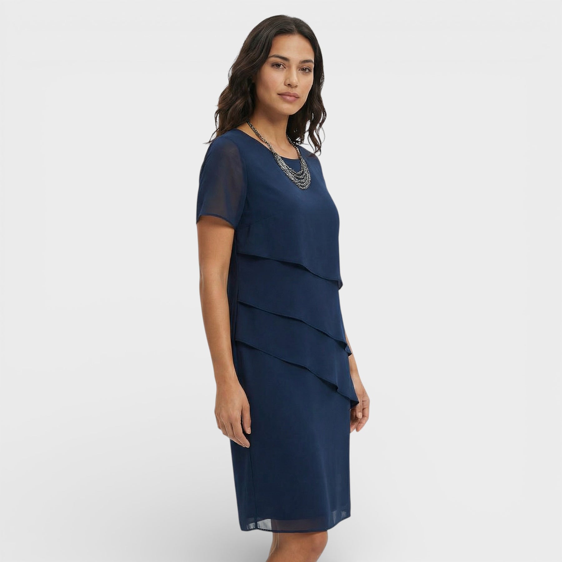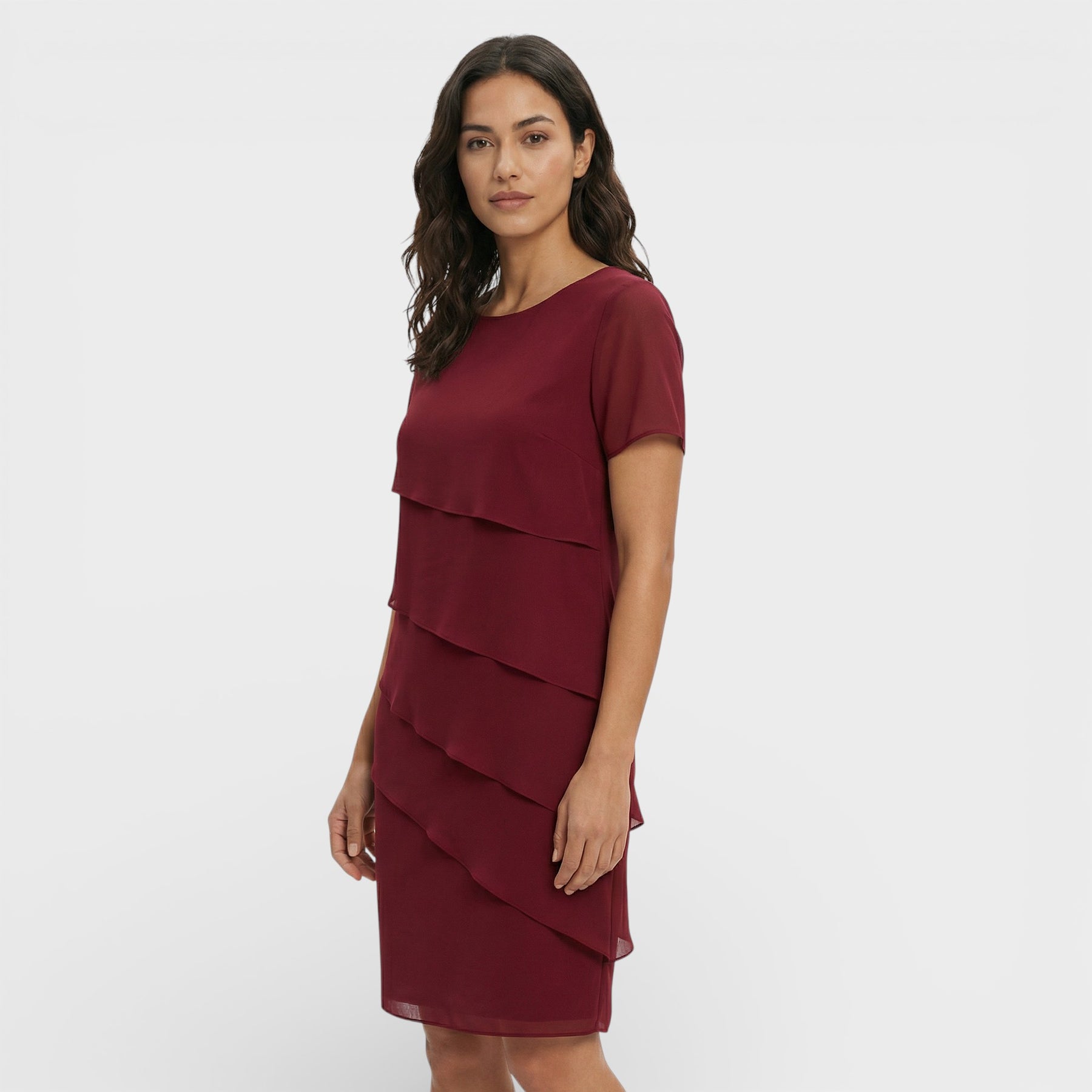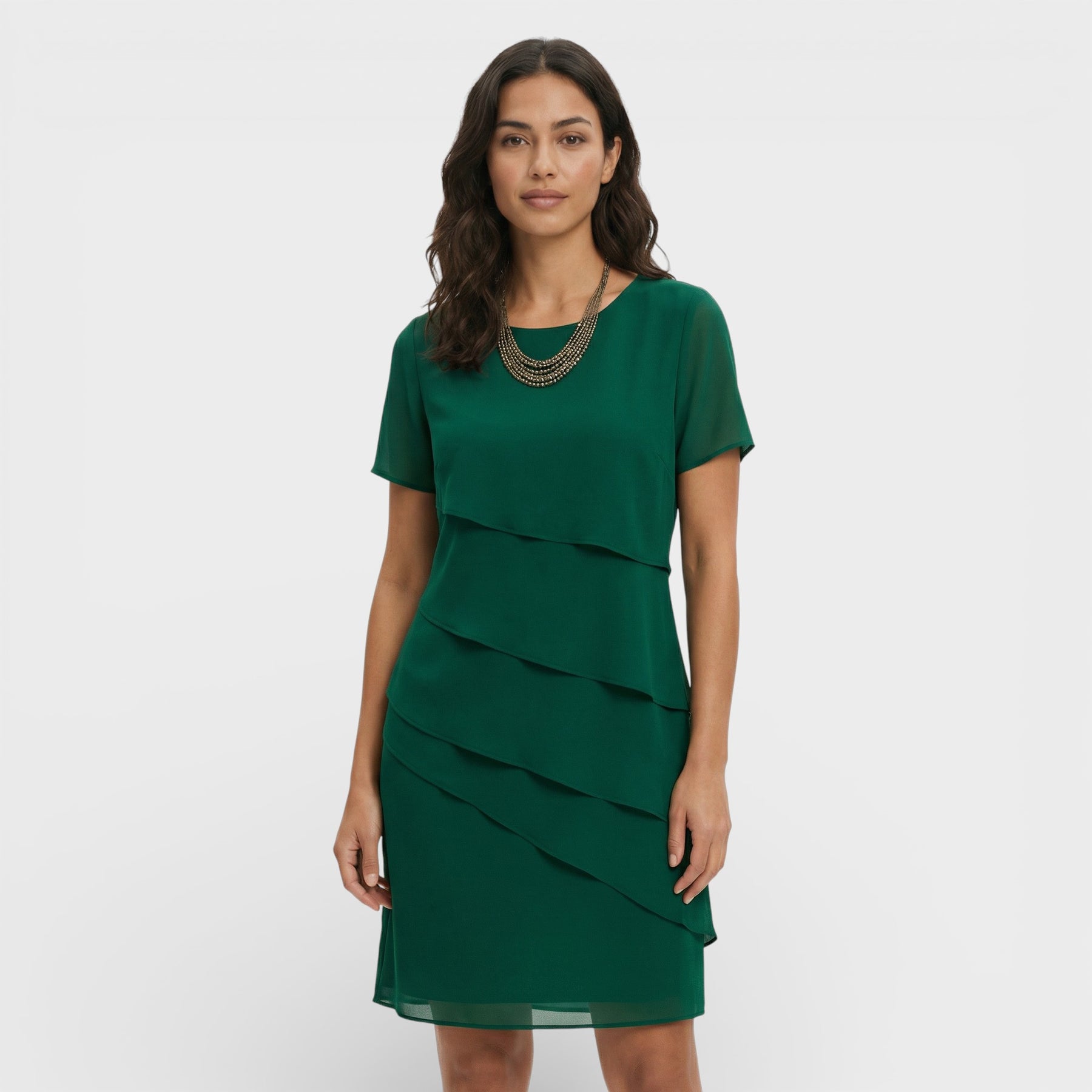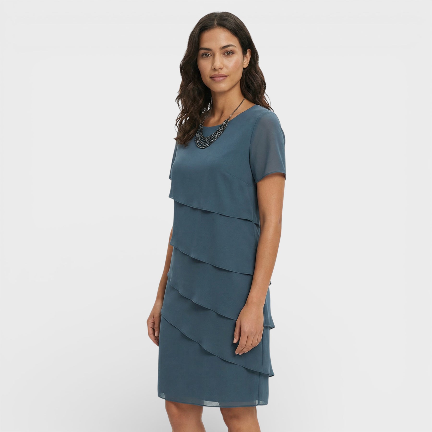 Este vestido para mujer combina un diseño en capas con una silueta fluida que resulta elegante y favorecedora. El corte limpio y las mangas cortas aportan comodidad en días cálidos, manteniendo un aire cuidado para celebraciones y planes especiales. Una pieza versátil que se adapta con facilidad a distintos eventos.
