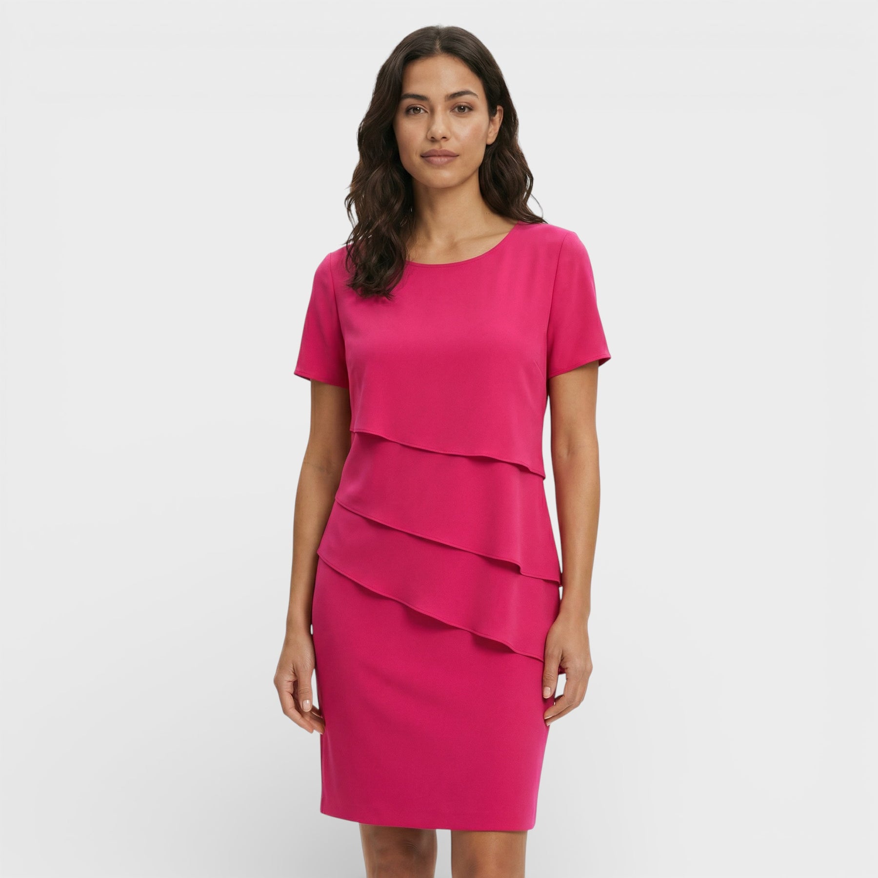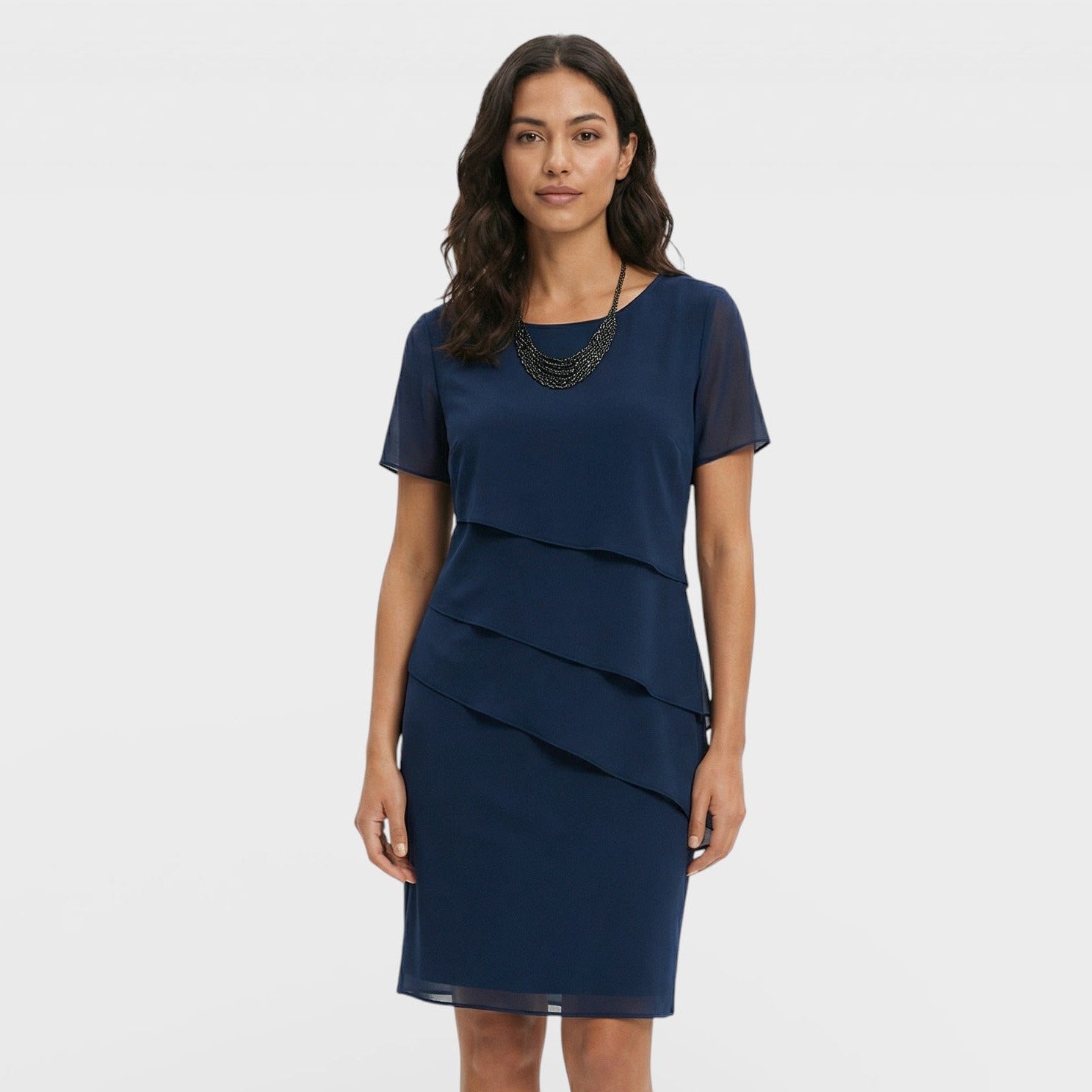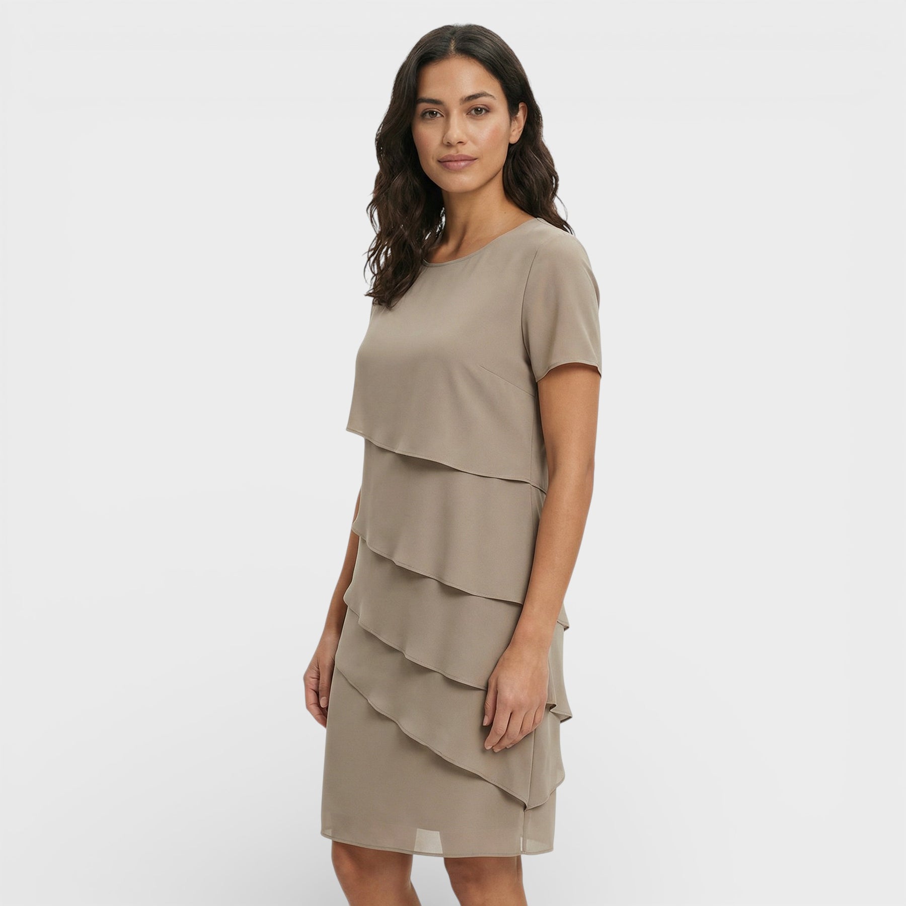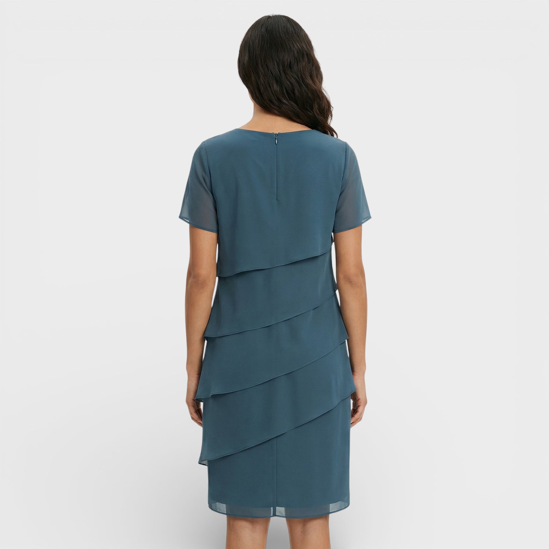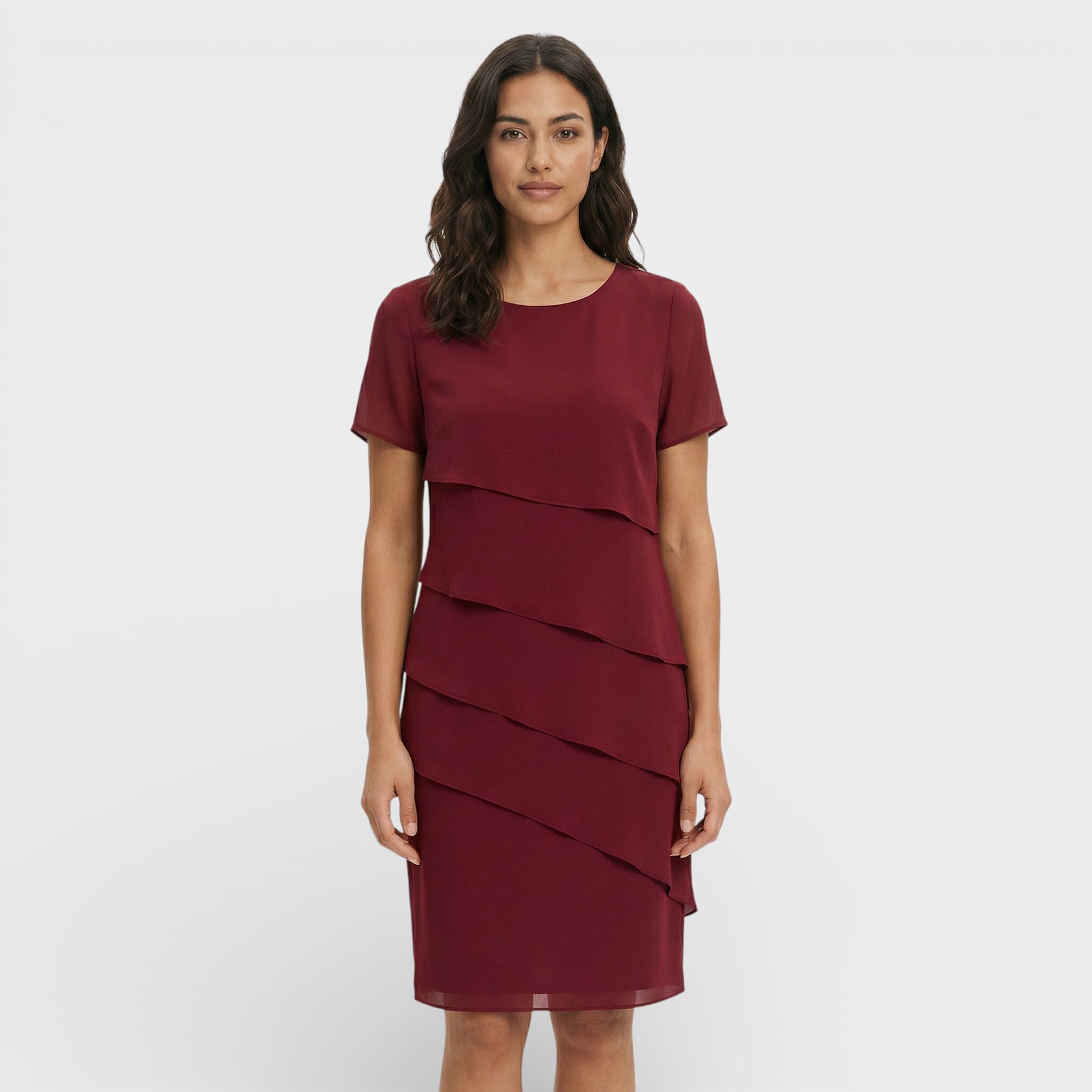 Este vestido para mujer combina un diseño en capas con una silueta fluida que resulta elegante y favorecedora. El corte limpio y las mangas cortas aportan comodidad en días cálidos, manteniendo un aire cuidado para celebraciones y planes especiales. Una pieza versátil que se adapta con facilidad a distintos eventos.