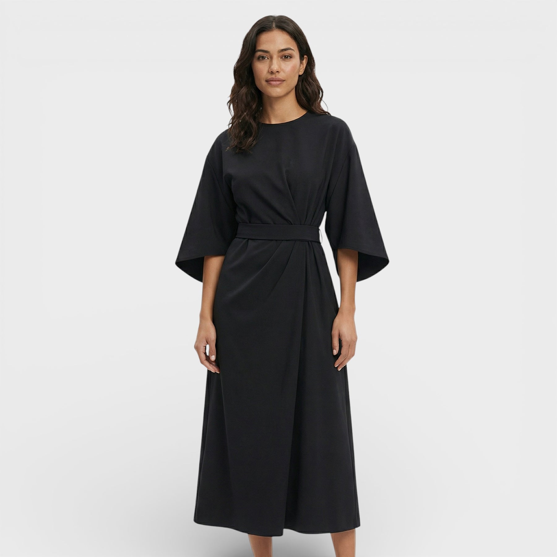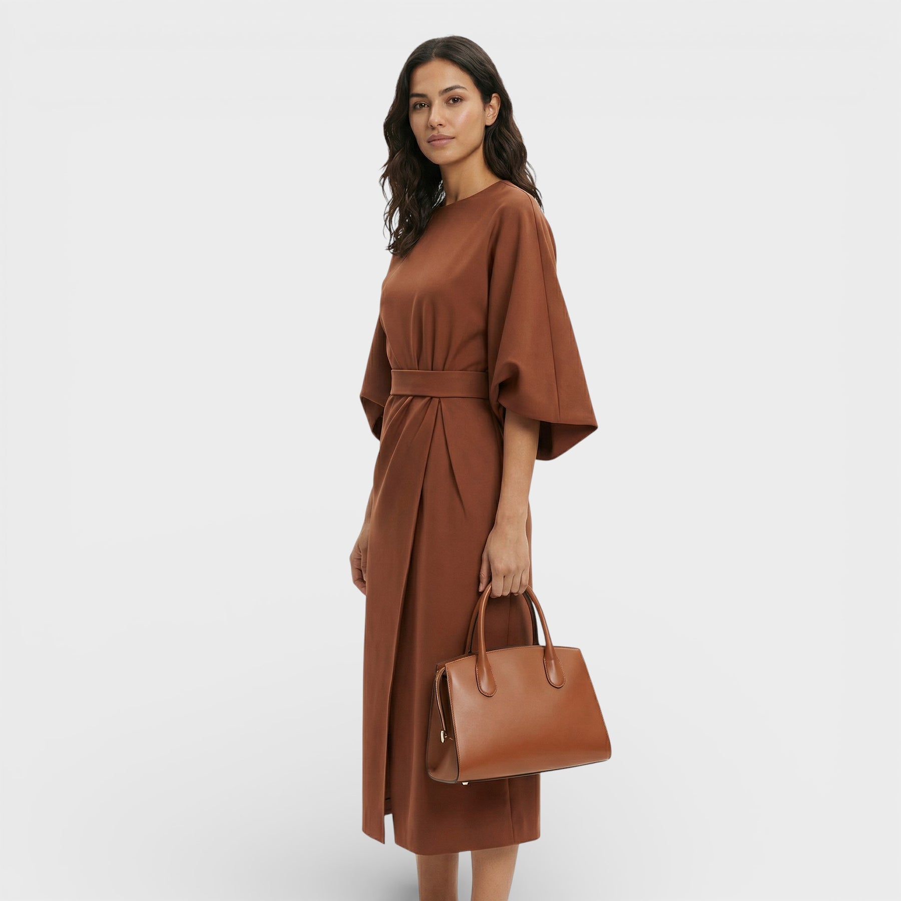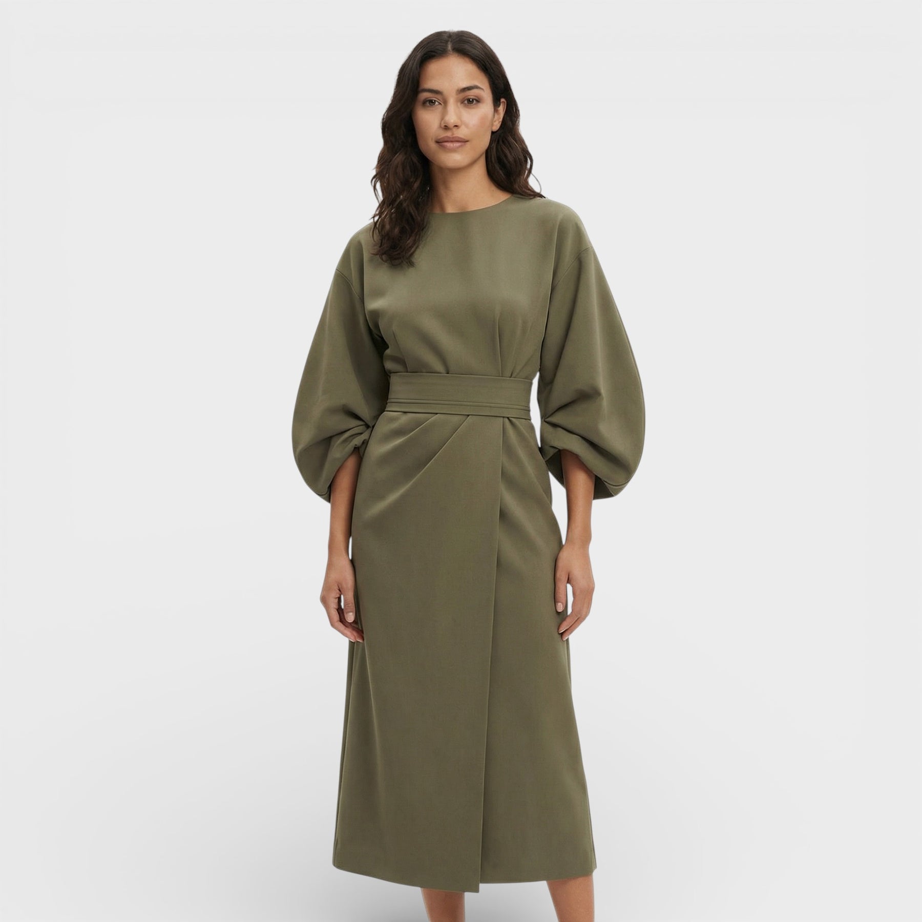 Este vestido elegante combina un diseño atemporal con detalles modernos que marcan la diferencia. Las mangas farol aportan un aire sofisticado y actual, mientras el cinturón define la cintura para una silueta femenina y equilibrada. Ideal para eventos especiales, oficina o citas de noche con un acabado cuidado.