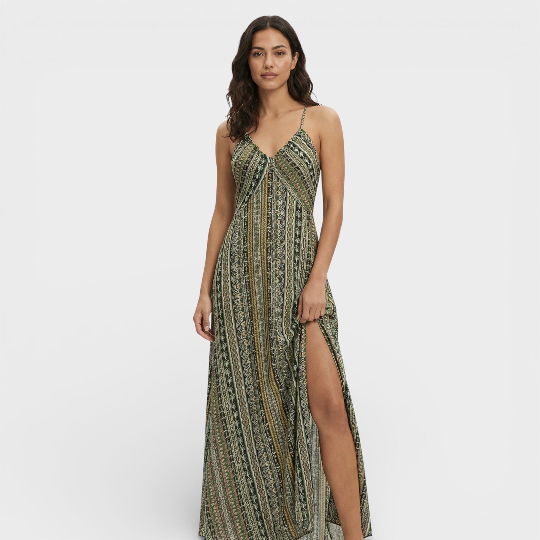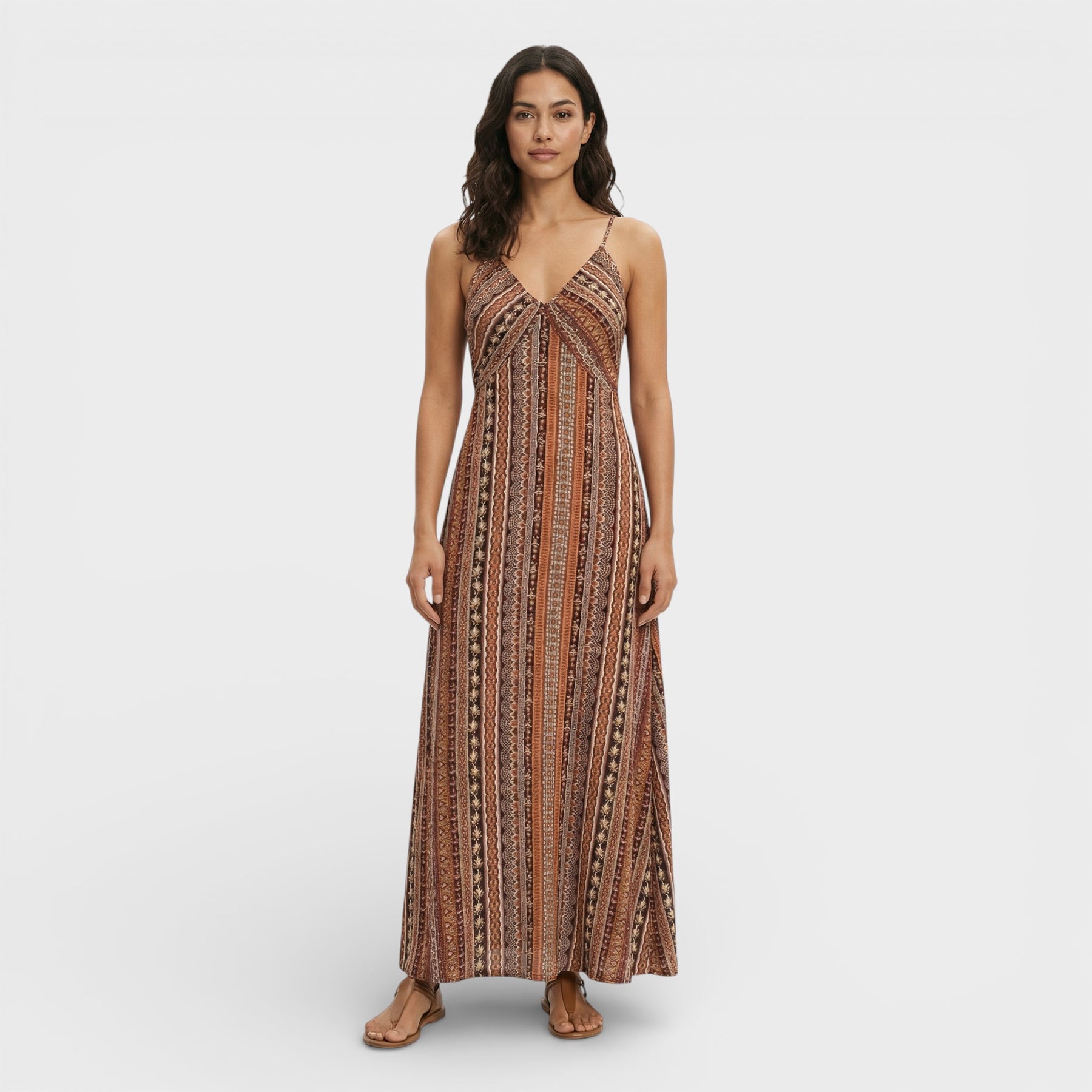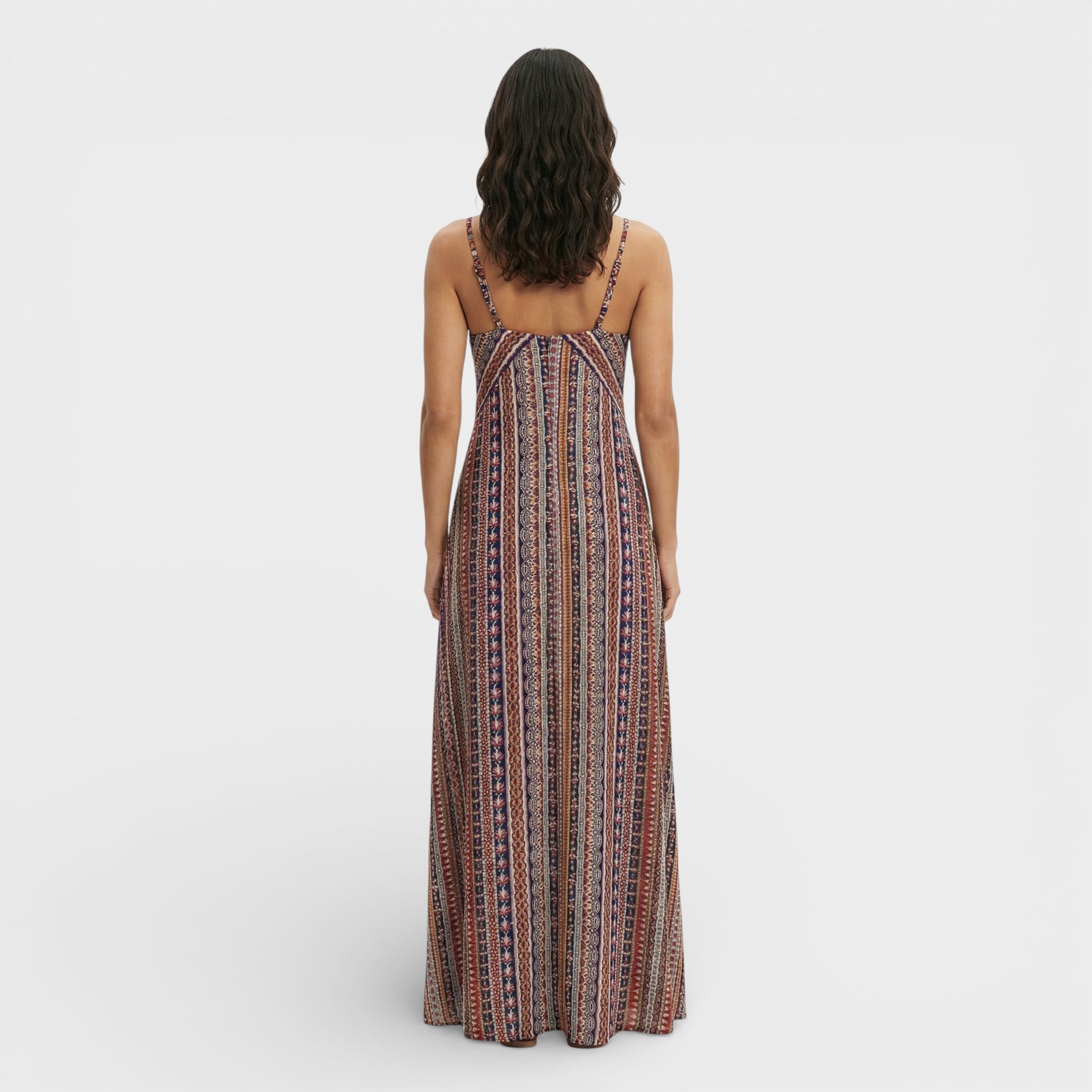 Este vestido largo con estampado étnico destaca por su diseño fluido y una espalda descubierta que aporta un aire femenino y desenfadado. Los volantes añaden ligereza y dinamismo, creando una silueta favorecedora y cómoda. Una pieza con personalidad, ideal para looks relajados con un toque actual.