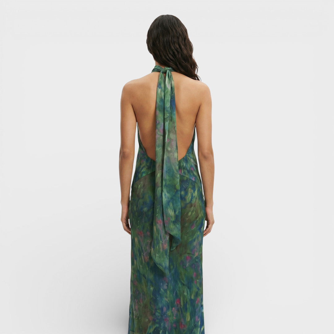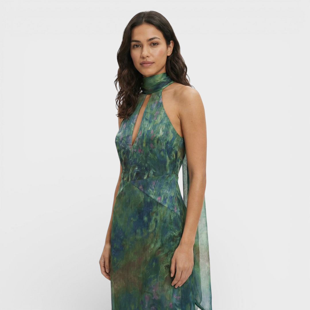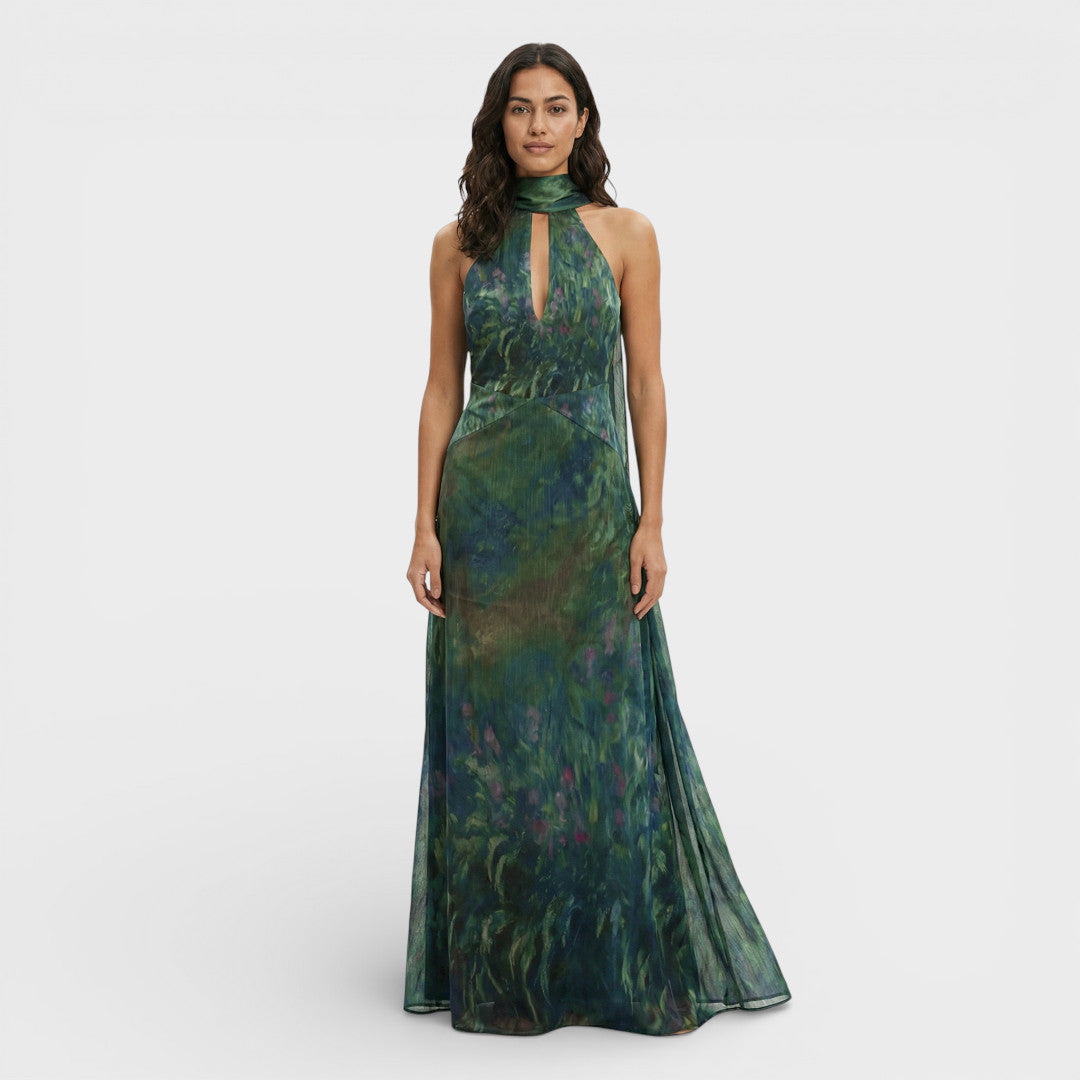 Este vestido largo de fiesta combina una presencia sofisticada con un estampado de inspiración pictórica en tonos azules, morados y verdes. El cuello alto con abertura sutil estiliza la parte superior, mientras la espalda abierta aporta un acabado elegante y actual. Su gasa ligera con textura cae con fluidez, ideal para eventos especiales.