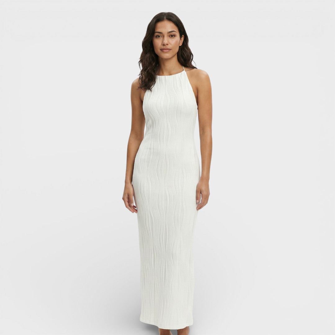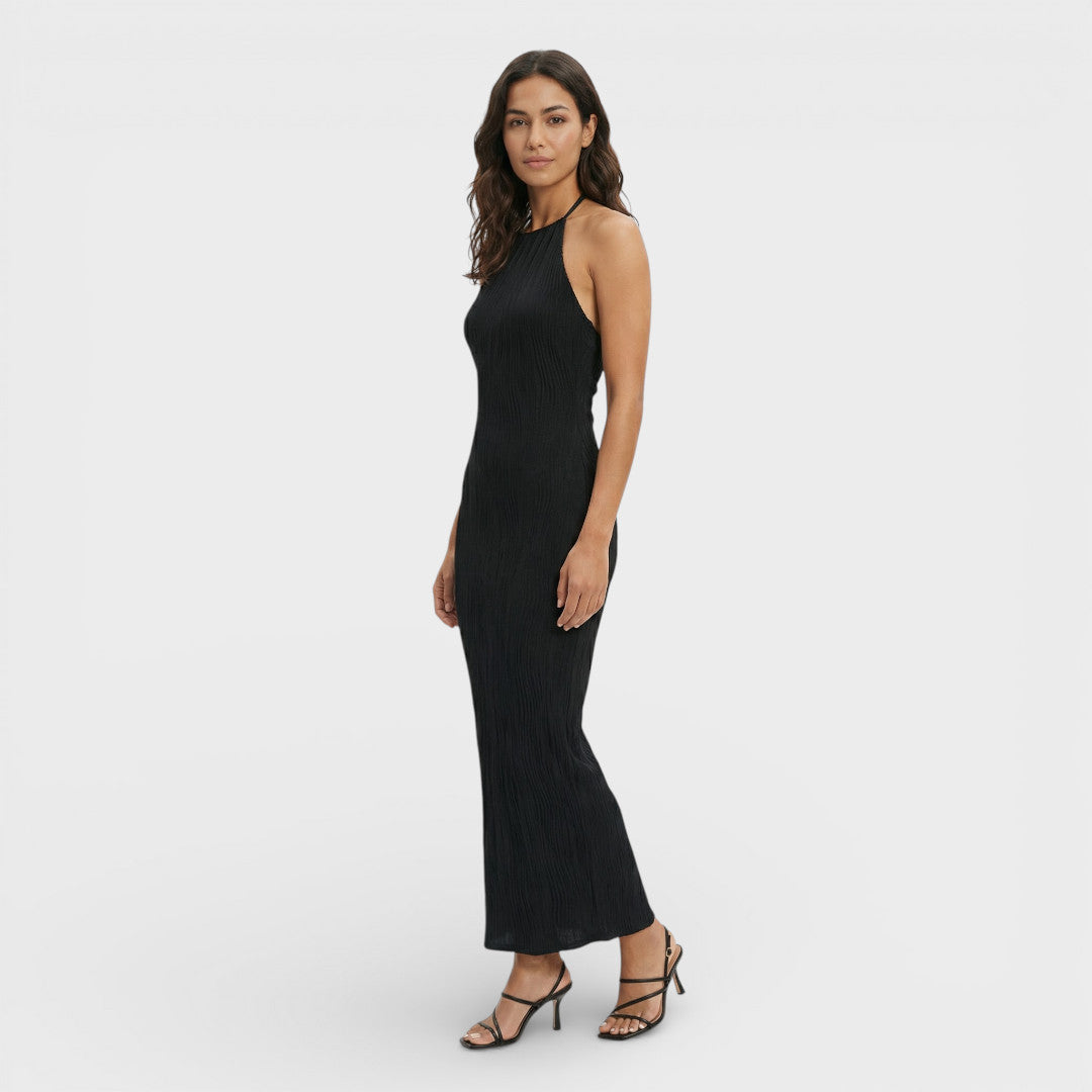 Un vestido largo sin mangas de silueta ceñida que estiliza con una línea limpia esta temporada. El fruncido sutil y la espalda con abertura aportan un toque más nocturno, ideal para cenas y eventos.