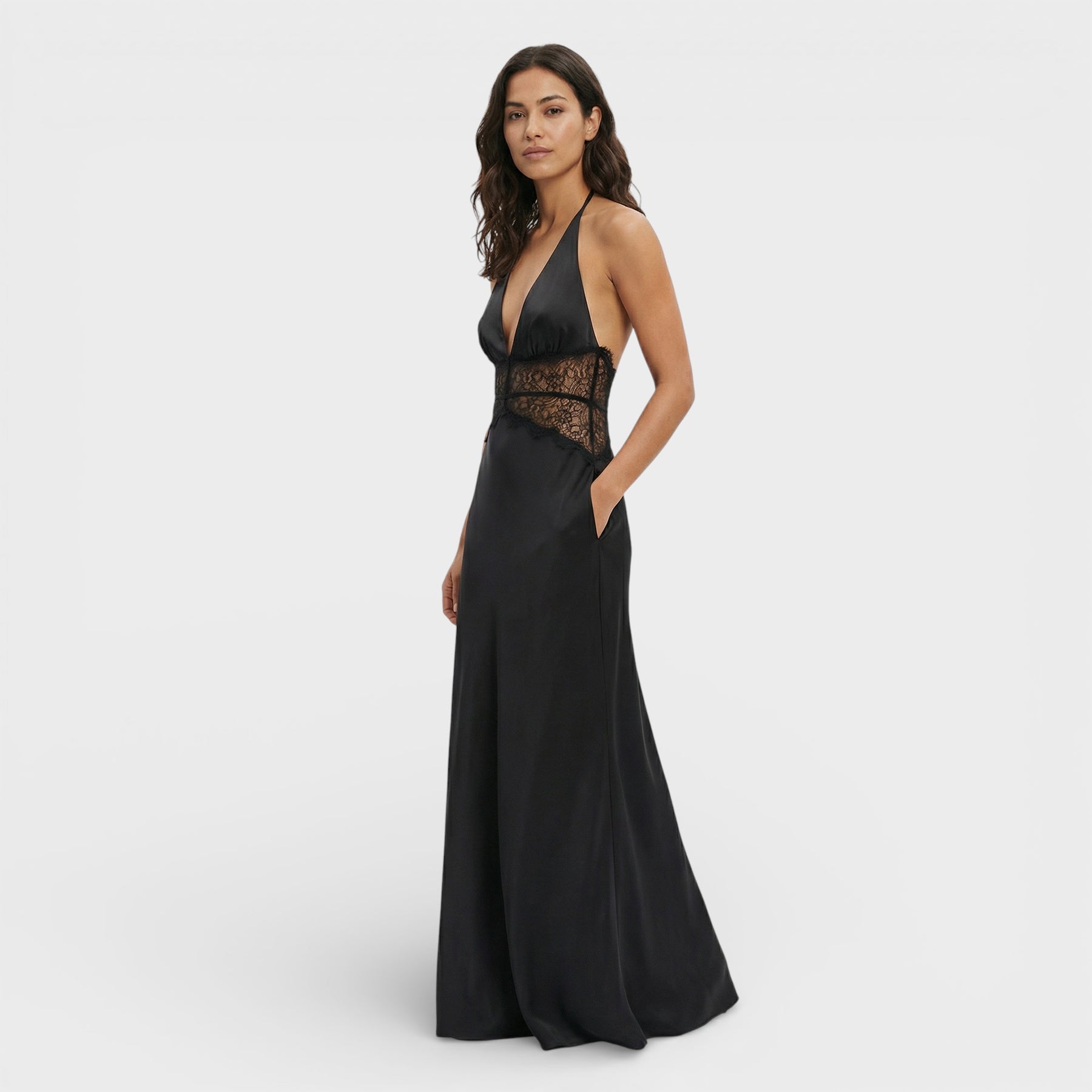 Este vestido largo para mujer combina un escote en V profundo con cuello halter y una espalda descubierta que aporta un aire sofisticado y atrevido a la vez. La cintura alta estiliza la figura, mientras que los detalles de encaje añaden textura y feminidad sin recargar el conjunto. Ideal para eventos de noche y celebraciones especiales donde quieres destacar con elegancia.
