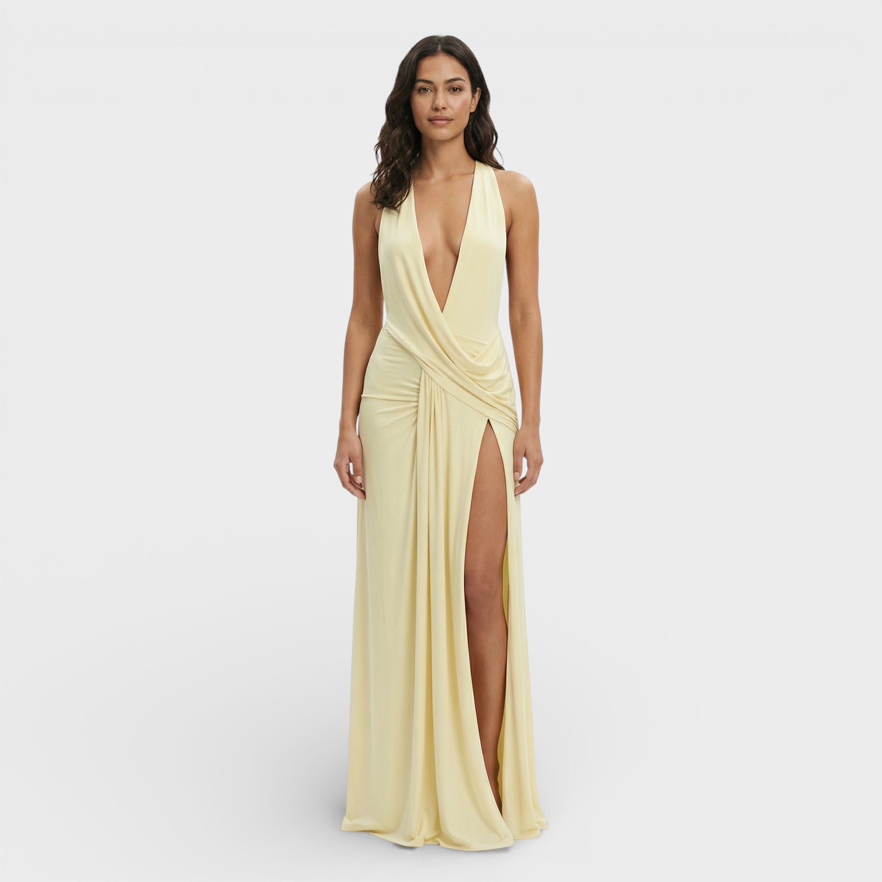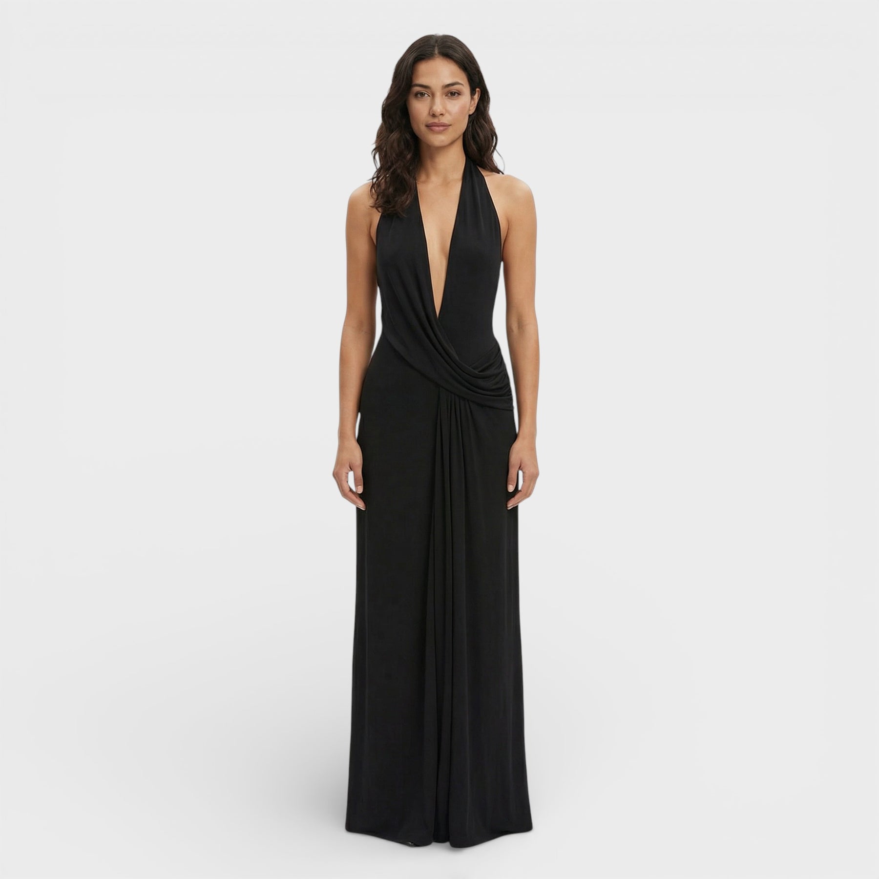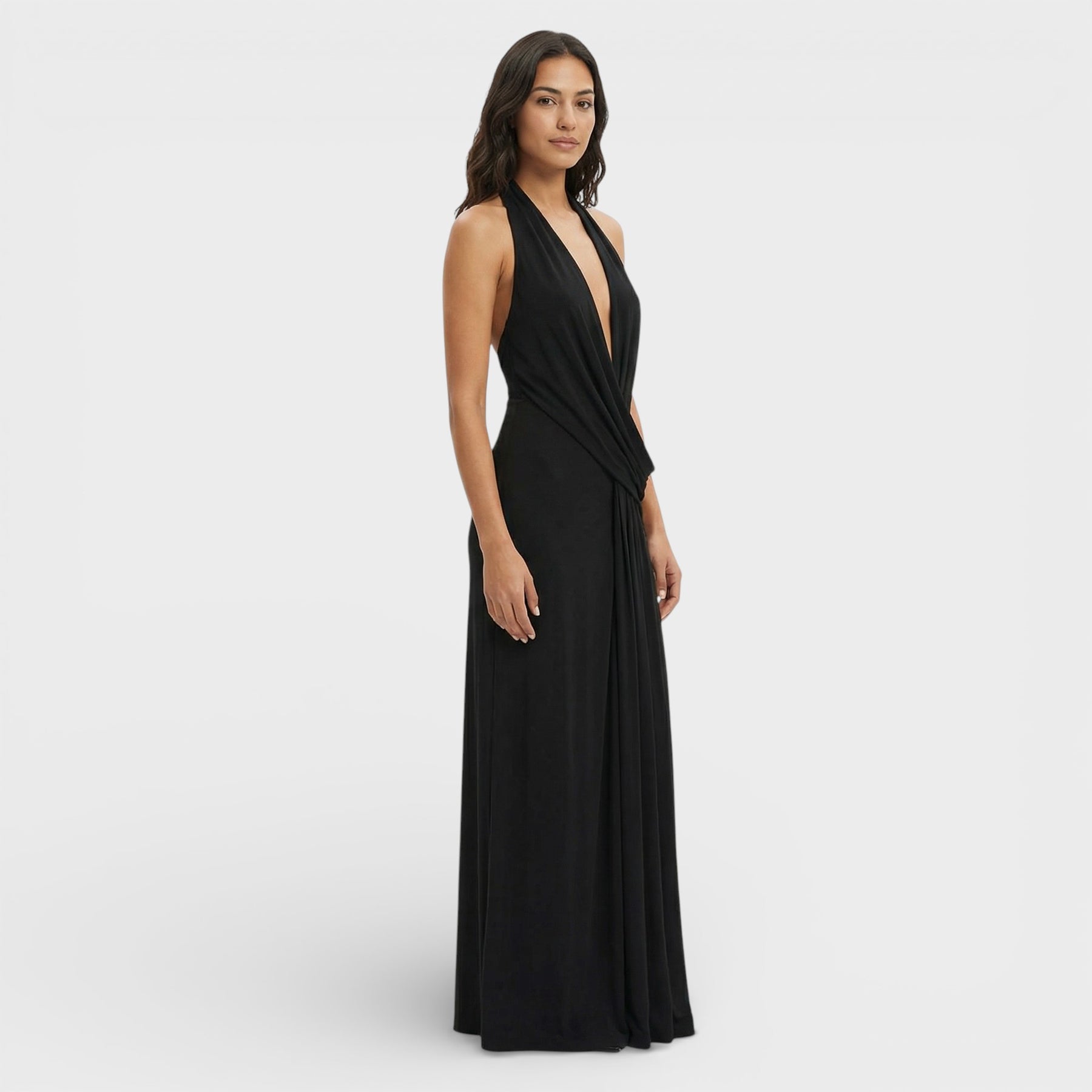 Este vestido largo para mujer combina un escote en V pronunciado con una espalda descubierta que aporta un aire sofisticado y atrevido a la vez. Su diseño sin mangas realza la silueta con ligereza, creando una línea fluida y femenina ideal para ocasiones especiales. Una pieza pensada para destacar con elegancia en eventos nocturnos y celebraciones.