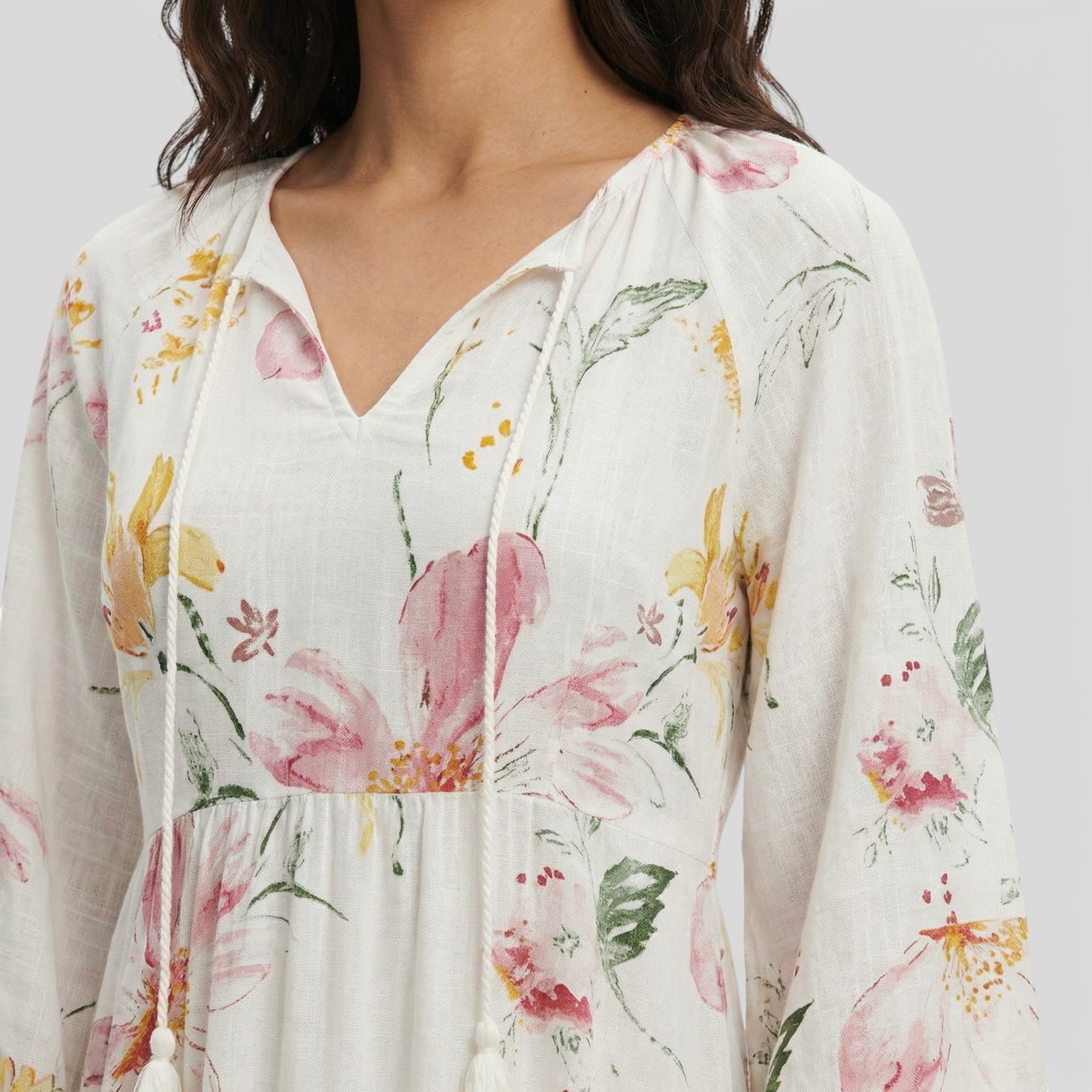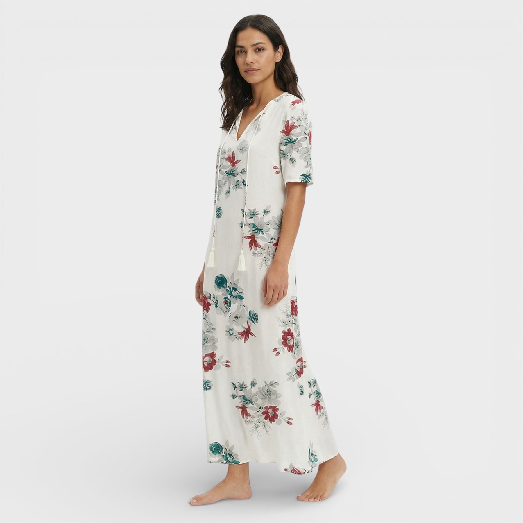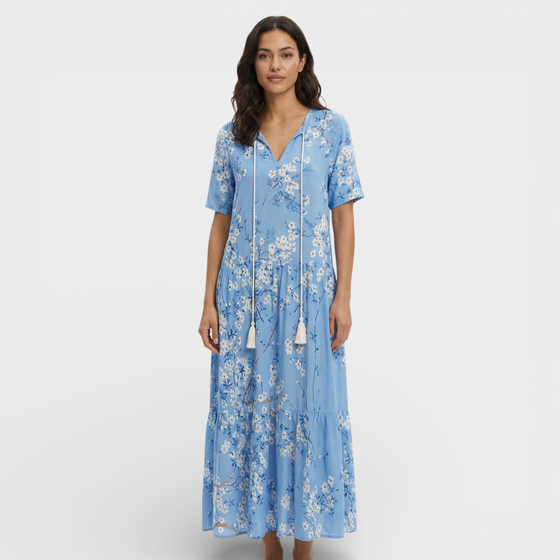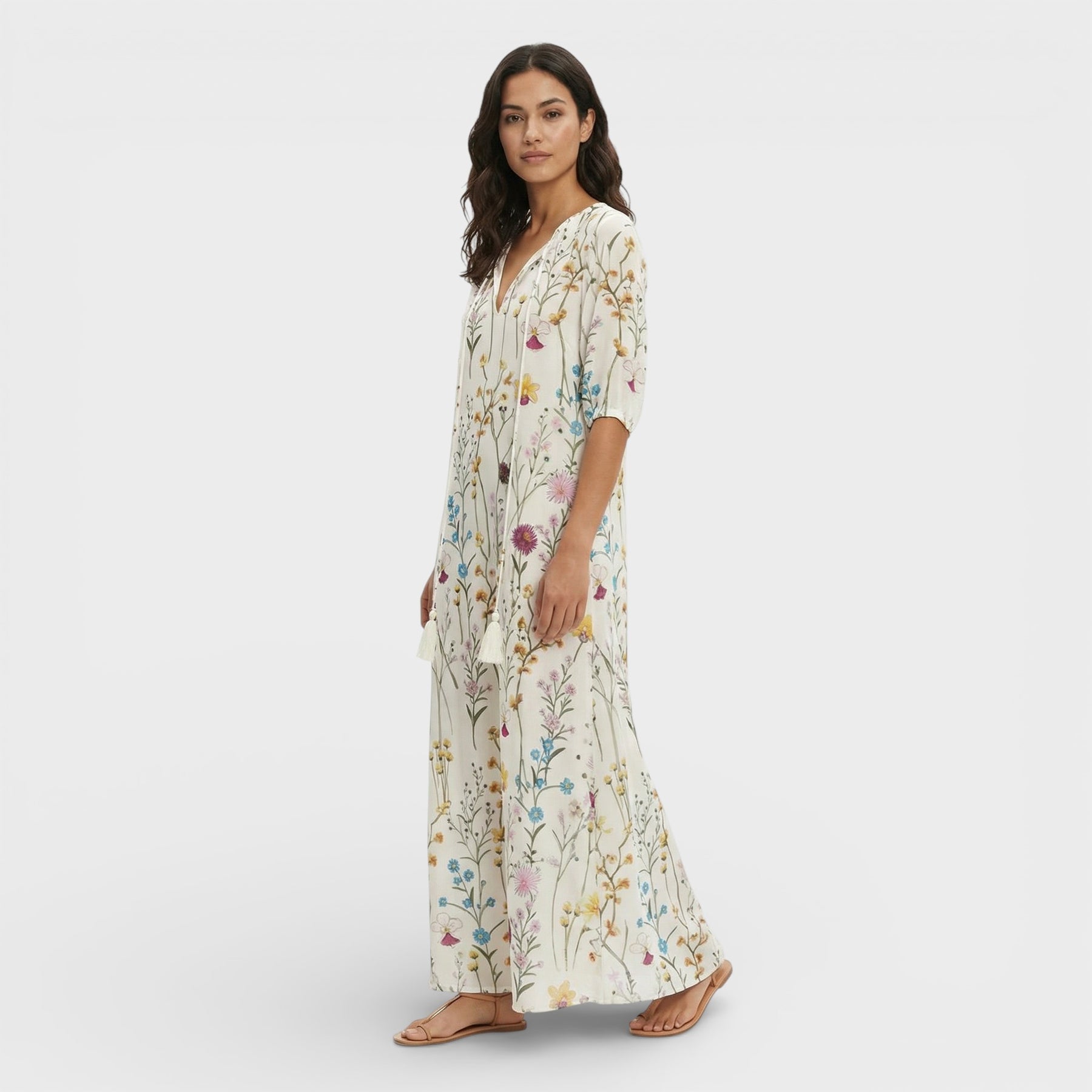 Este vestido maxi de estilo bohemio combina una silueta fluida con un escote en pico y manga corta para un look femenino y natural. Su caída ligera y su ajuste cómodo lo convierten en una opción práctica y elegante para planes de día o de tarde. Perfecto para llevar con sandalias, alpargatas o accesorios más especiales.