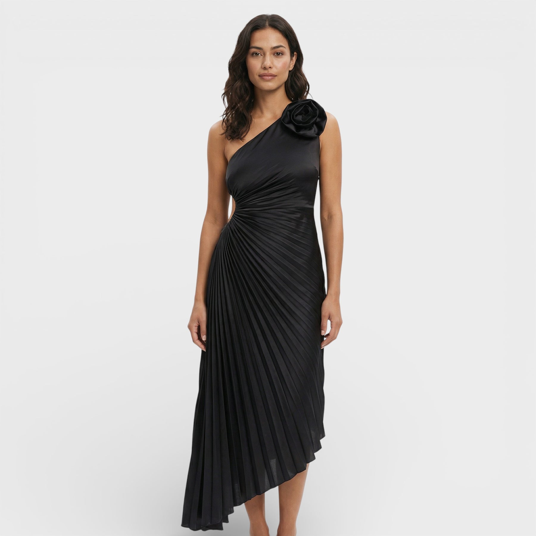 Este vestido maxi plisado con diseño de un solo hombro aporta una elegancia fluida y contemporánea a cualquier ocasión especial. Su silueta estilizada y el movimiento natural del tejido crean una presencia sofisticada, perfecta para eventos formales, celebraciones o planes nocturnos con un toque refinado. Una pieza versátil que equilibra modernidad y feminidad con naturalidad.