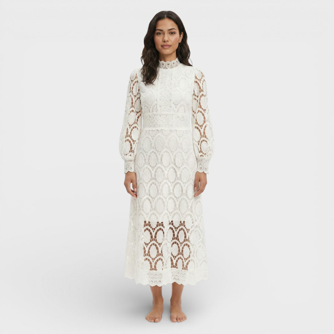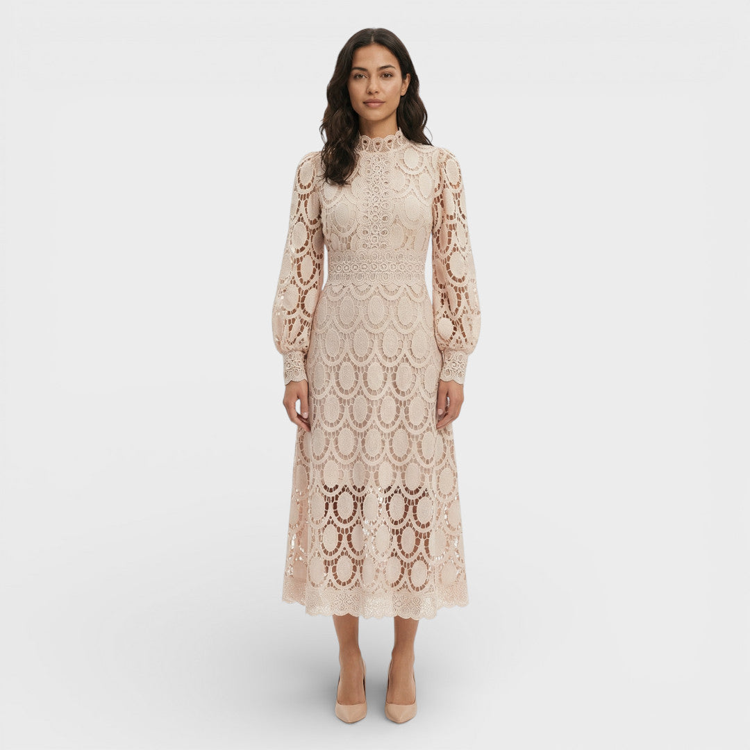 Este vestido midi de encaje aporta una elegancia serena con un diseño pensado para momentos especiales. El cuello alto y las mangas abullonadas equilibran sofisticación y feminidad, mientras la silueta en A acompaña el movimiento con una caída ligera.