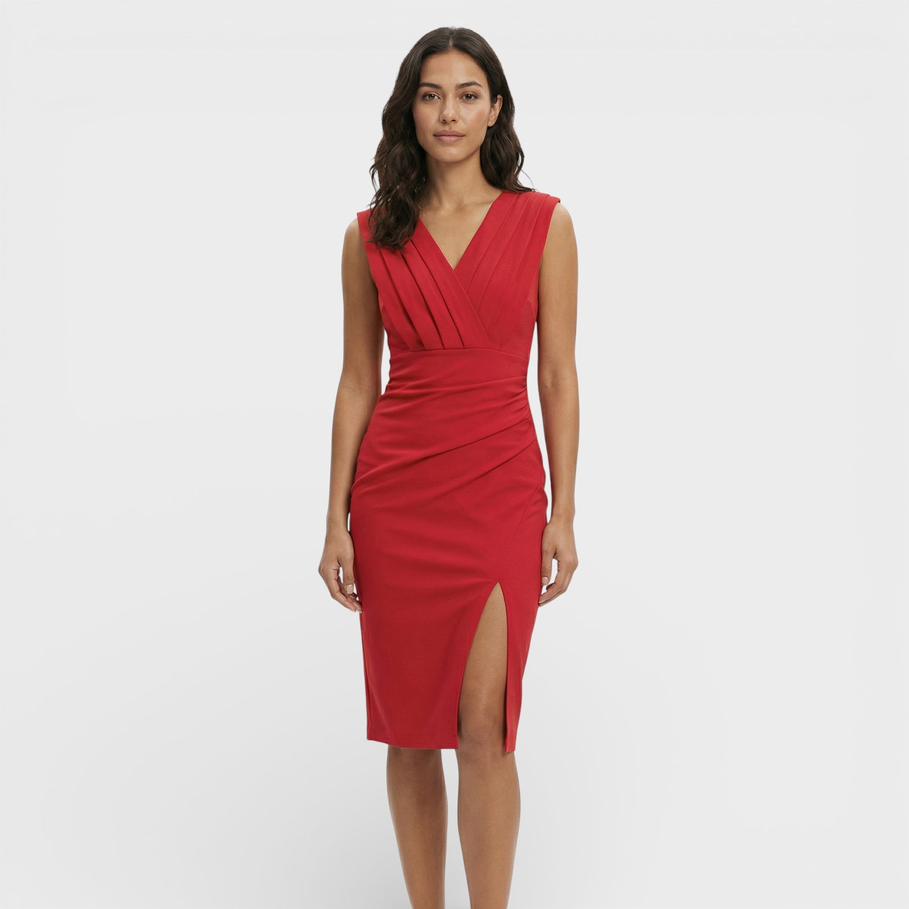 Este vestido midi combina un escote en pico favorecedor con una silueta ajustada que realza la figura con naturalidad. La abertura lateral aporta fluidez y un toque sofisticado, manteniendo un equilibrio perfecto entre comodidad y estilo. Una prenda versátil pensada para planes de día y eventos de tarde con un acabado pulido.