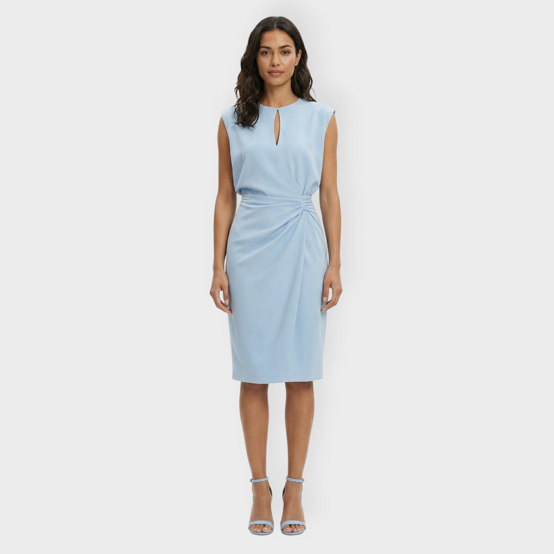 Un vestido midi sin mangas de líneas limpias con drapeado lateral que define la cintura con sutileza. El detalle de abertura en el escote aporta un toque moderno, perfecto para eventos, cenas y ocasiones formales.