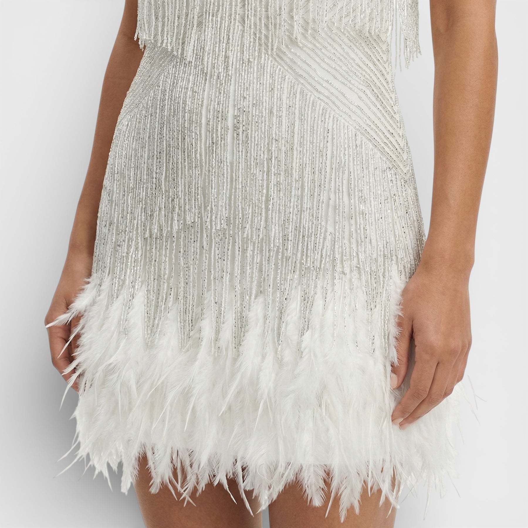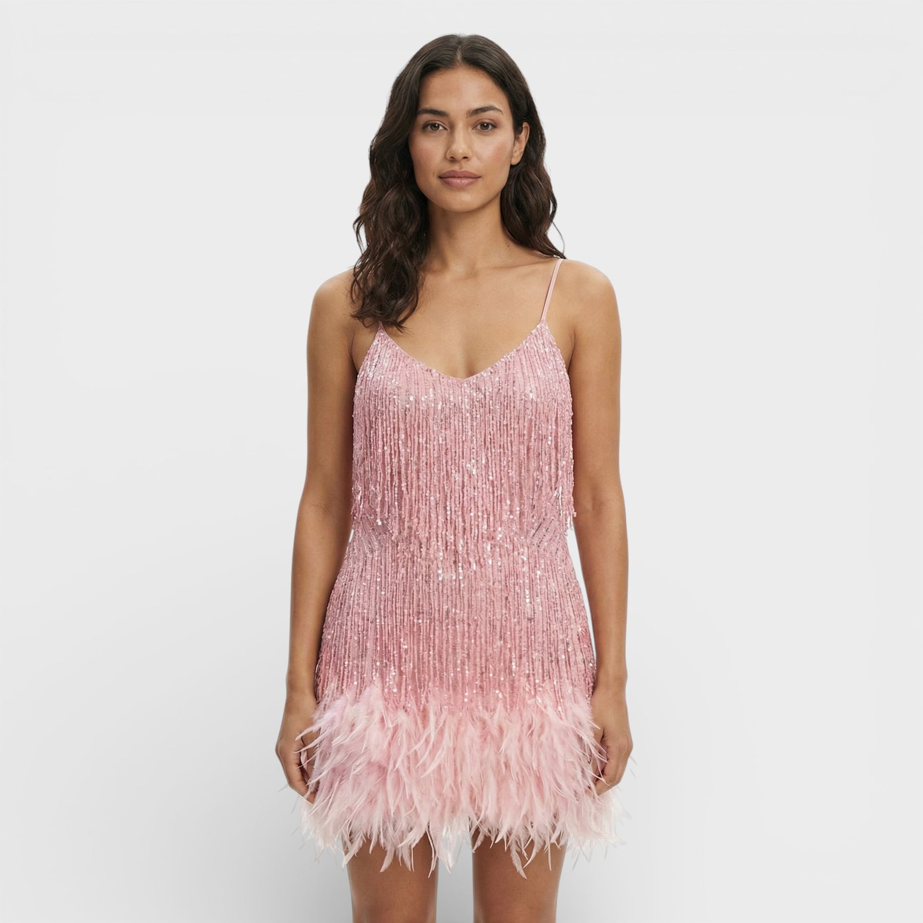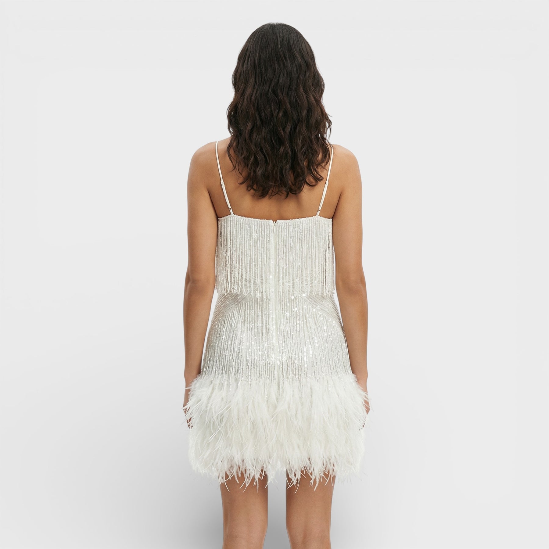 Este vestido mini con plumas está diseñado para noches especiales, con un acabado luminoso y una silueta que estiliza sin esfuerzo. Los tirantes delicados y el bajo ligeramente evasé aportan movimiento y un efecto muy favorecedor. Ideal para fiestas, cócteles y eventos donde quieres destacar con elegancia.